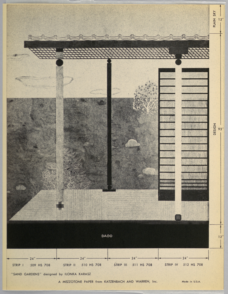 This is a Page from a sample book. It was designed by Ilonka Karasz and made by Katzenbach and Warren, Inc.. It is dated 1948 and we acquired it in 1959. Its medium is mezzotone print on paper. It is a part of the Wallcoverings department.