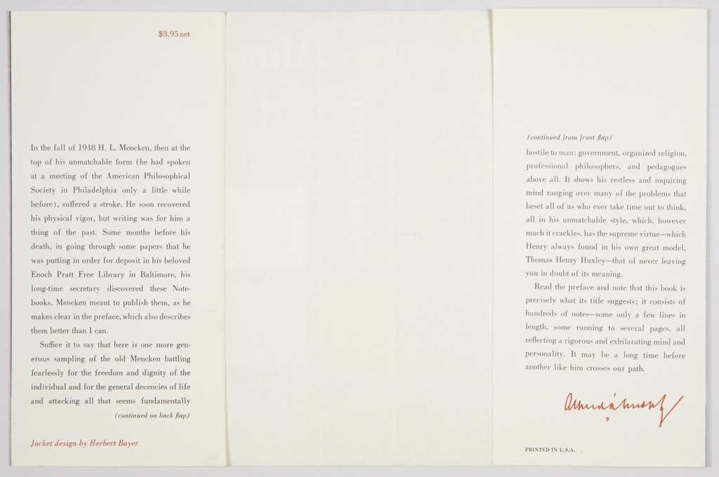 Printed in red ink, verso, left flap, along the bottom: Jacket design by Herbert Bayer; recto, vertically, bottom of back cover: Photo: Alfred A. Knopf