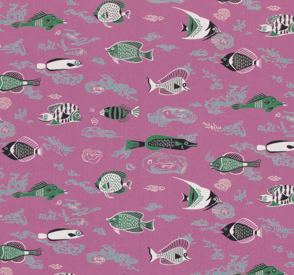 Aquaria, which was produced in multiple colorways, is seen here with green and white fish swimming in a sea of pink with subtle light blue accents. A Signature Fabrics spread in the January 1953 issue of Harper’s Bazaar featured summer dresses for women and girls, the former constructed from Aquaria in this colorway and the latter from Sea Secrets, also by Munsell. (1)