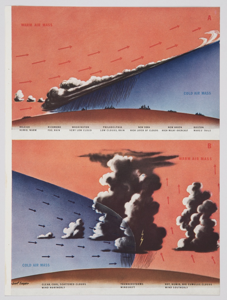 Print, Warm and Cold Air Masses; Designed by Herbert Bayer (American, b. Austria, active Germany and USA, 1900–1985); Client: Skyways; gravure print on paper; 28.6 × 21.3 cm (11 1/4 × 8 3/8 in.); Museum purchase with funding provided by the Buddy Taub Foundation, Dennis A. Roach and Jill Roach Directors; 2016-54-366