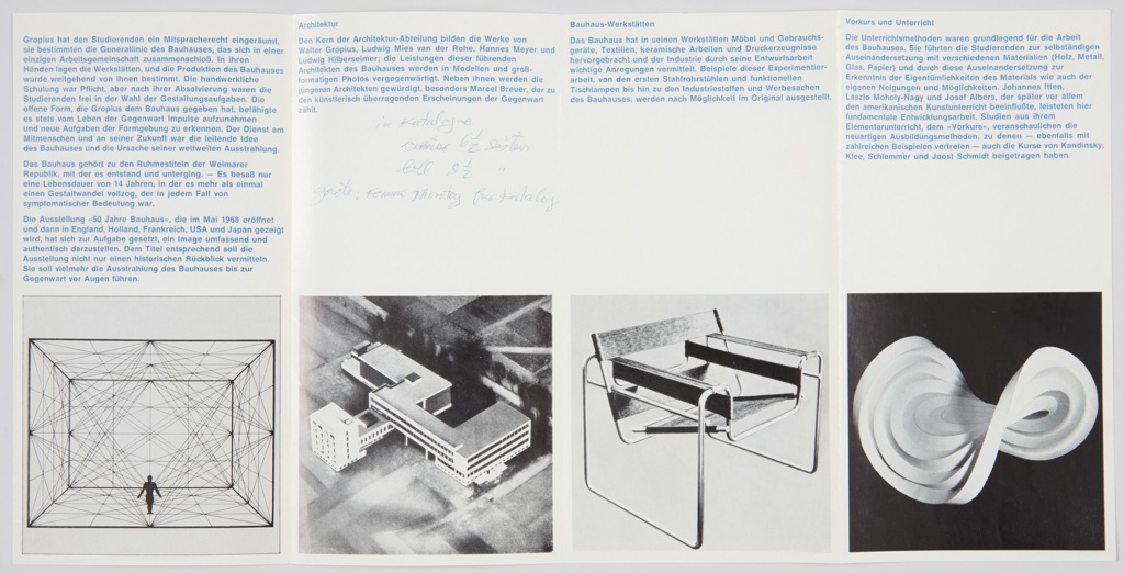 Brochure, Bauhaus 50 Jahre; Designed by Herbert Bayer (American, b. Austria, active Germany and USA, 1900–1985); letterpress on white glossy paper; 20.9 × 10.6 cm (8 1/4 × 4 3/16 in.) Open: 20.9 × 42 cm (8 1/4 × 16 9/16 in.); Museum purchase with funding provided by the Buddy Taub Foundation, Dennis A. Roach and Jill Roach Directors; 2016-54-389