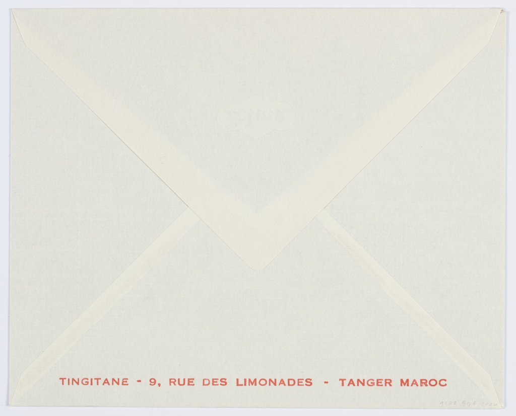Envelope, Tingitane, Tangier, Morocco; Designed by Herbert Bayer (American, b. Austria, active Germany and USA, 1900–1985); print on paper; 12.5 × 15.5 cm (4 15/16 × 6 1/8 in.); Museum purchase with funding provided by the Buddy Taub Foundation, Dennis A. Roach and Jill Roach Directors; 2016-54-576
