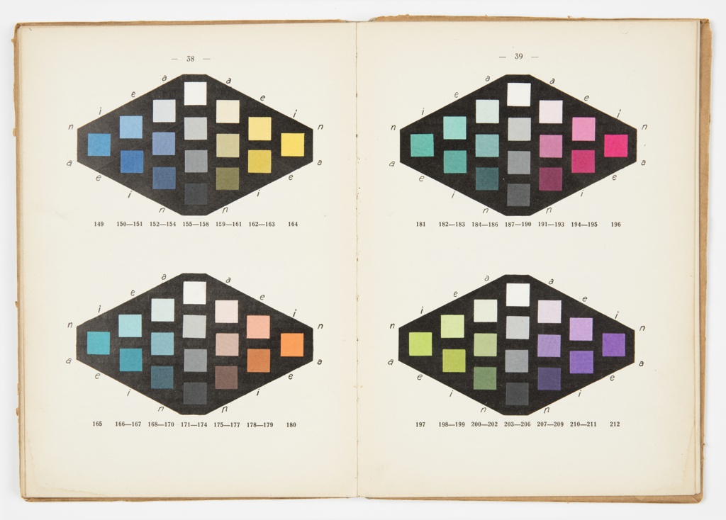 Chemist and Nobel Prize winner Wilhelm Ostwald was influenced by Ewald Herring’s opponent color theory, and based his color model on red/green and yellow/blue opponent pairs. Inspired by Munsell, he used bi-colored spinning disks to “scientifically” calculate intermediate steps, but of course the measurements were still based on his subjective perception.