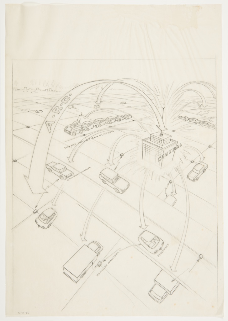 In the 1960s, after a career designing automobiles for General Motors and American Motors Corporation, industrial designer George Lawson focused his attention on freelance designs and independent projects. This group of five drawings is part of Lawson’s proposal for Hub Cities, a radical design proposition that envisioned a restructuring of city systems across the United States to create better living through less densely-populated cities and safer, more efficient transportation.