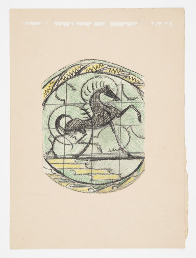 Drawing, Design for Plate, Horse; Designed by William Hunt Diederich (American, b. Hungary, 1884–1953); color pencil and charcoal on paper, mounted on cream paper; 17.8 × 14 cm (7 × 5 1/2 in.); Gift of D. Wigmore Fine Art; 2018-16-10