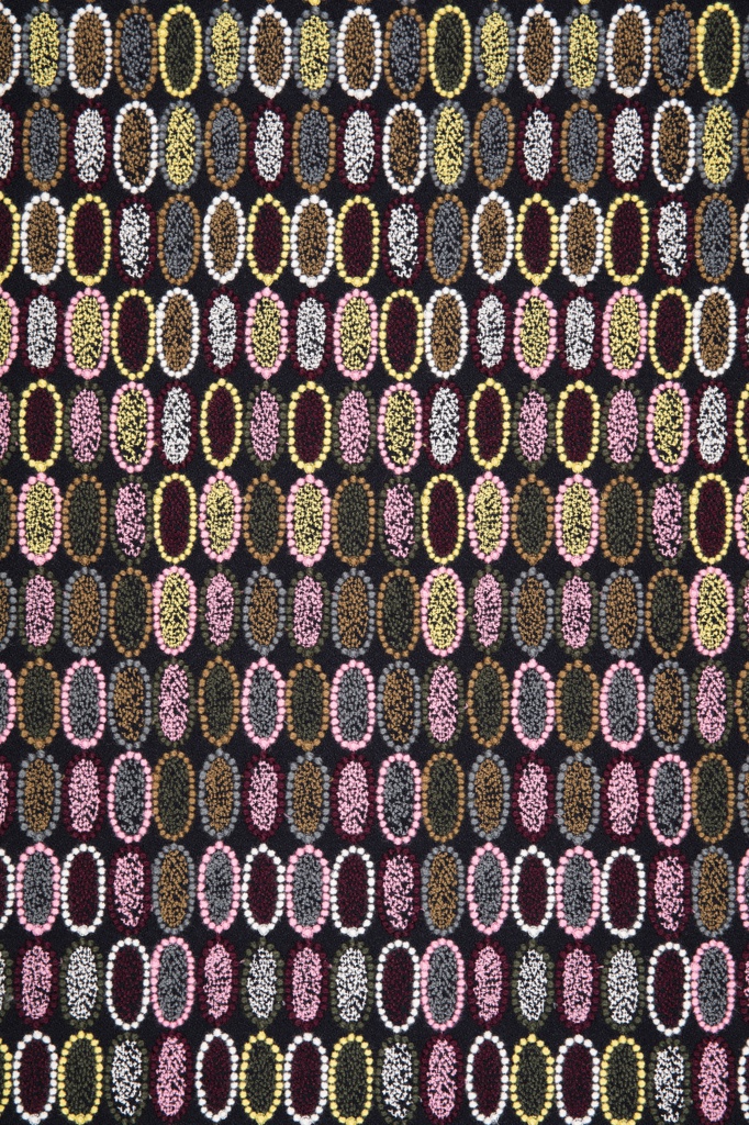 Akira Minagawa is best known as a fashion designer, but has also created textiles, illustrated books, exhibitions, and immersive installations. His design process always begins with drawing -- a practice of visual storytelling which informs all of his designs. This richly detailed design was inspired by rows of colorful tarts in a pastry shop window. Tarte uses raised embroidered dots to create the “crust,” while the filling is made up of a scattering of small crosses, like hatch marks.