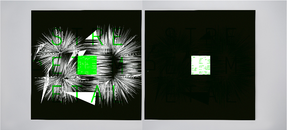 Back: A white box sits on a black background. Front: A green box is surrounded by exploding shards of white on a black background. Letters spelling out "STREET METAL" appear on front and back.