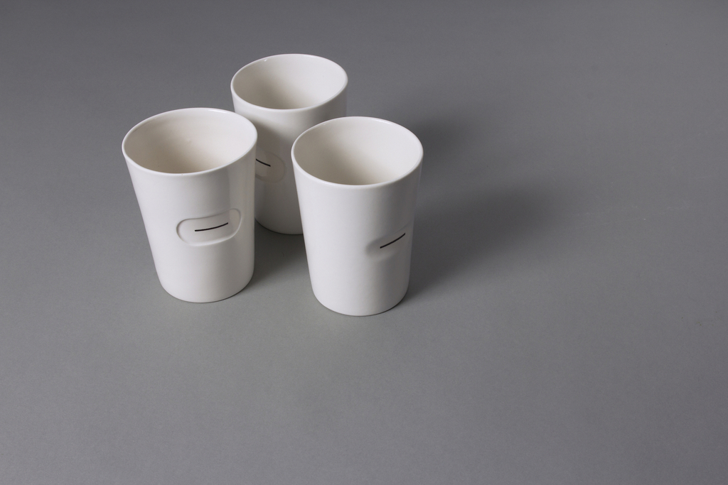 The ceramic cup has thumb-shaped indentations that invite touch. The mug is thinner at these indented areas, allowing the user to feel the temperature change. A thin black line provides a visual target.