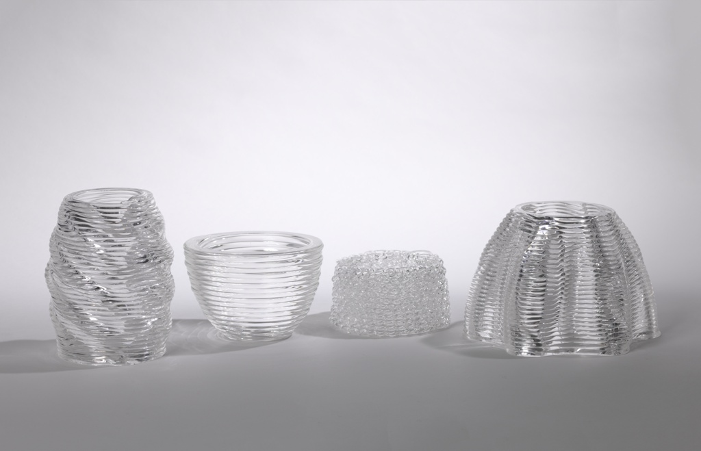 This vessel prototype from the GLASS series is one of four sought for acquisition by Cooper Hewitt. It is among the first products of a new method for creating glass structures with additive manufacturing technology (also called 3D printing), developed by Neri Oxman and MIT Media Lab’s Mediated Matter group. The technique was unveiled by Oxman and her Mediated Matter group in September, 2015.The platform, known as G3DP (Glass 3D Printing), is the first-of-its-kind glass printing process, which extrudes molten glass layer by layer to yield optically transparent structures. By leveraging the extrusion process, Oxman and her team develop glass products that are mechanically more robust, optically tunable, and structurally customizable than those manufactured through glass sintering or selective laser melting, other 3D printing methods used for glass. Each piece in the series is built up from tubes of molten glass, layer by layer, yielding optically transparent structures. The designers varied the printing times and temperatures in creating different structures.