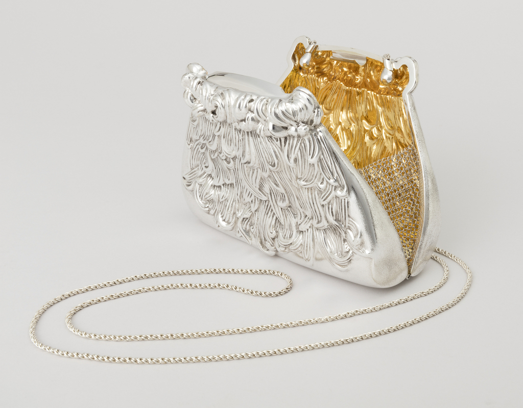 In this evening bag featuring a chrysanthemum motif, Galmer mixes new and traditional techniques and materials for a fresh take on a well-established form and decorative theme. After creating concept drawings and a series of models and molds, he hand-chased a silver master form to create the resin mold from which the final product emerges. He then applies gilding and details like the clasp and flexible mesh side panels. He centered the fine chain strap on each side of this bag so it would not hang unevenly.