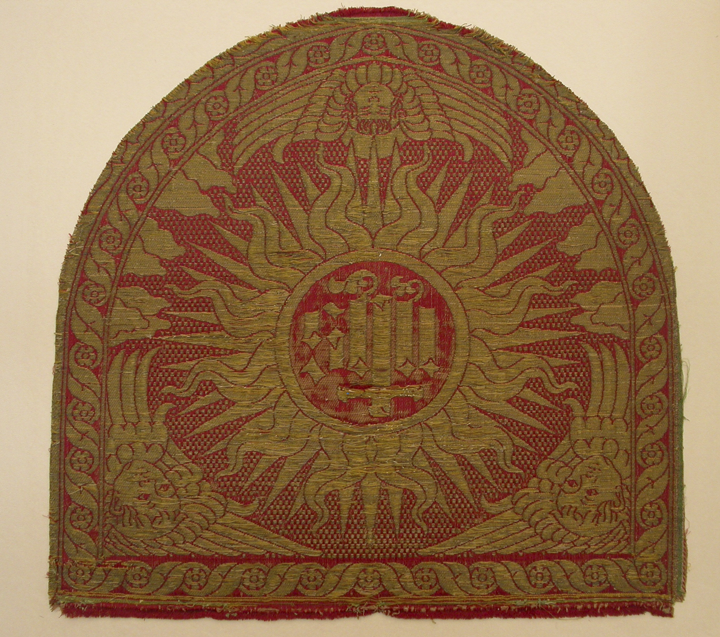 This is a Cope hood. It is dated 17th century. Its medium is silk, metallic thread and its technique is lampas (two interconnected structures: 4&1 satin plus 2/2 twill; metallic wefts bound on the front in 1/3 twill by the twill warp). It is a part of the Textiles department.
