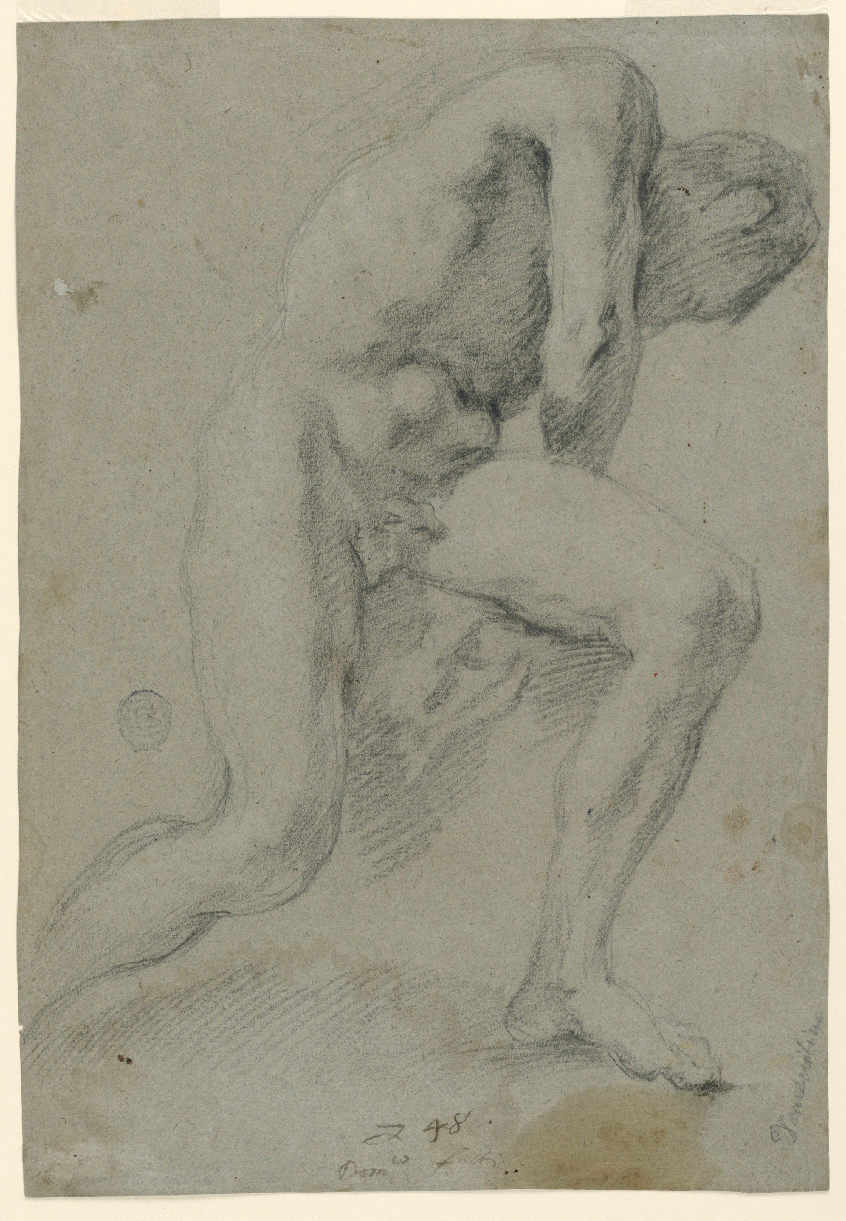 Drawing, Male nude; Italy; black chalk on gray laid paper; 36.4 x 25 cm (14 5/16 x 9 13/16 in.); Gift of Mary A. Peoli; 1896-16-10
