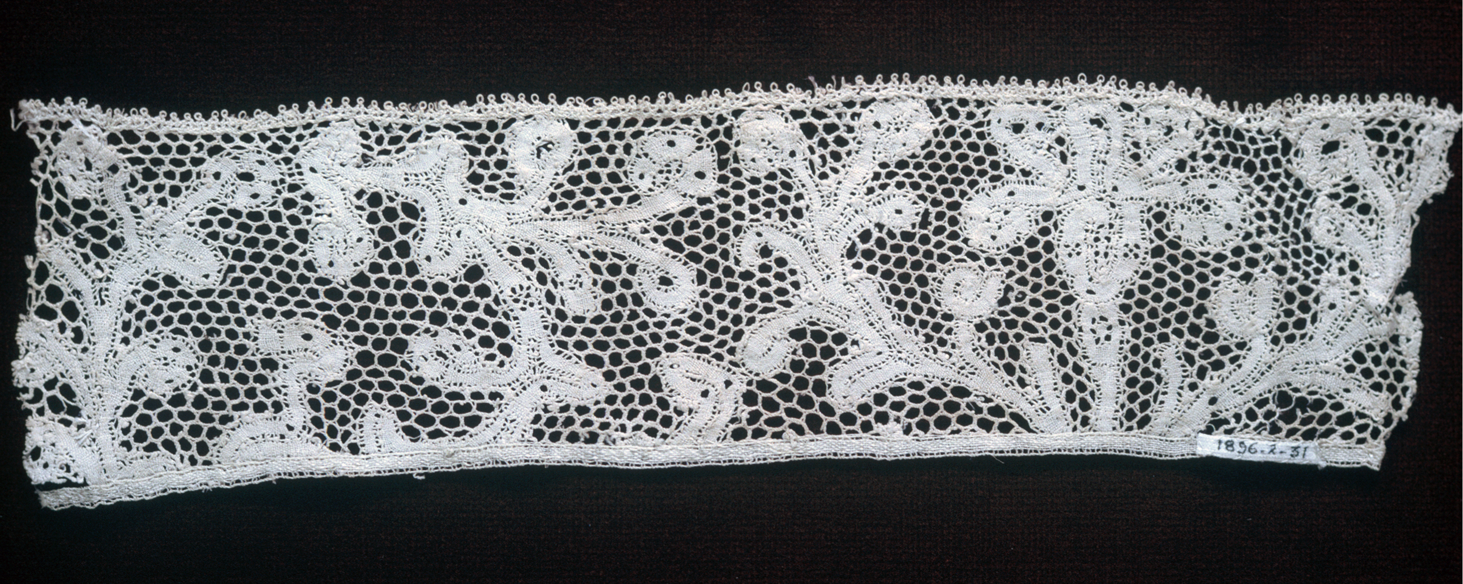 This is a Fragment. It is dated 17th century. Its medium is linen and its technique is bobbin lace, discontinuous tape. It is a part of the Textiles department.