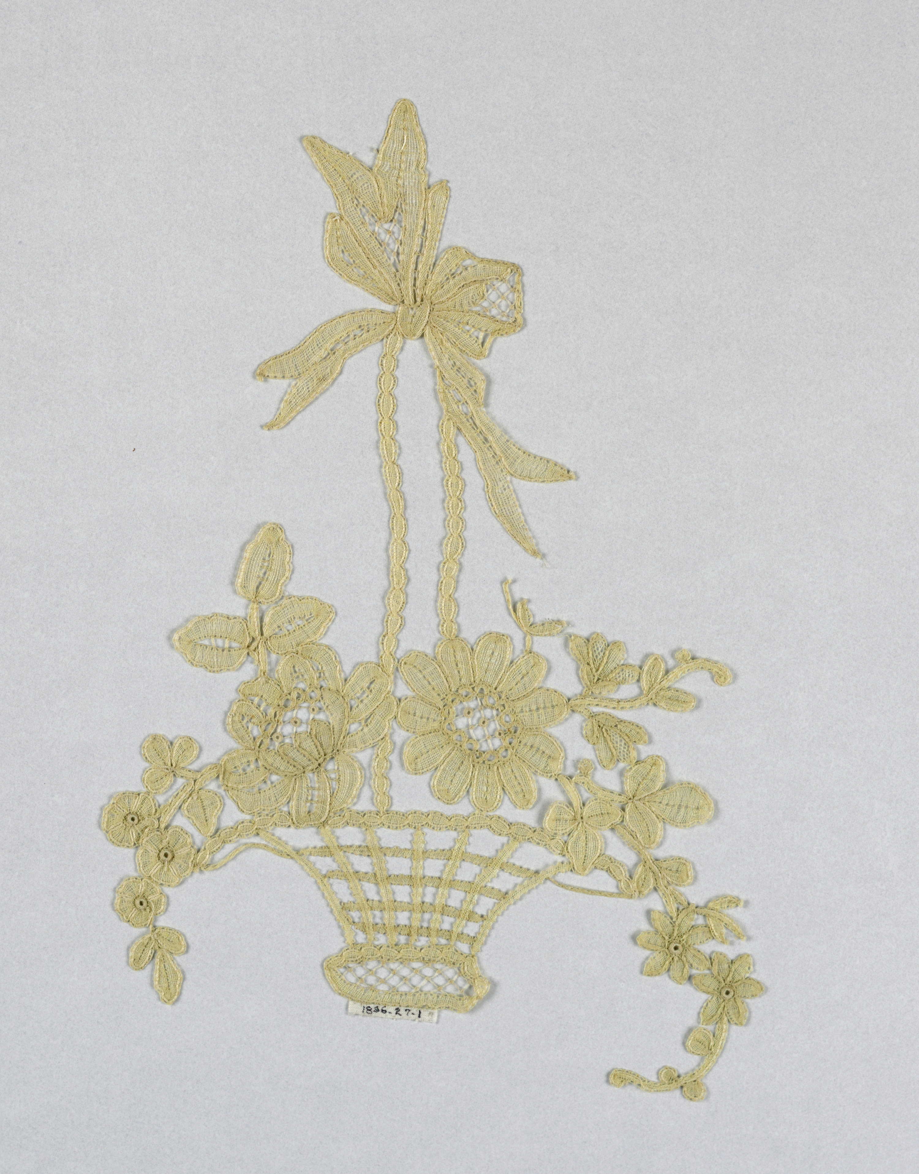 This is a Ornament. It is dated 19th century. Its medium is linen and its technique is brussels style bobbin lace. It is a part of the Textiles department.