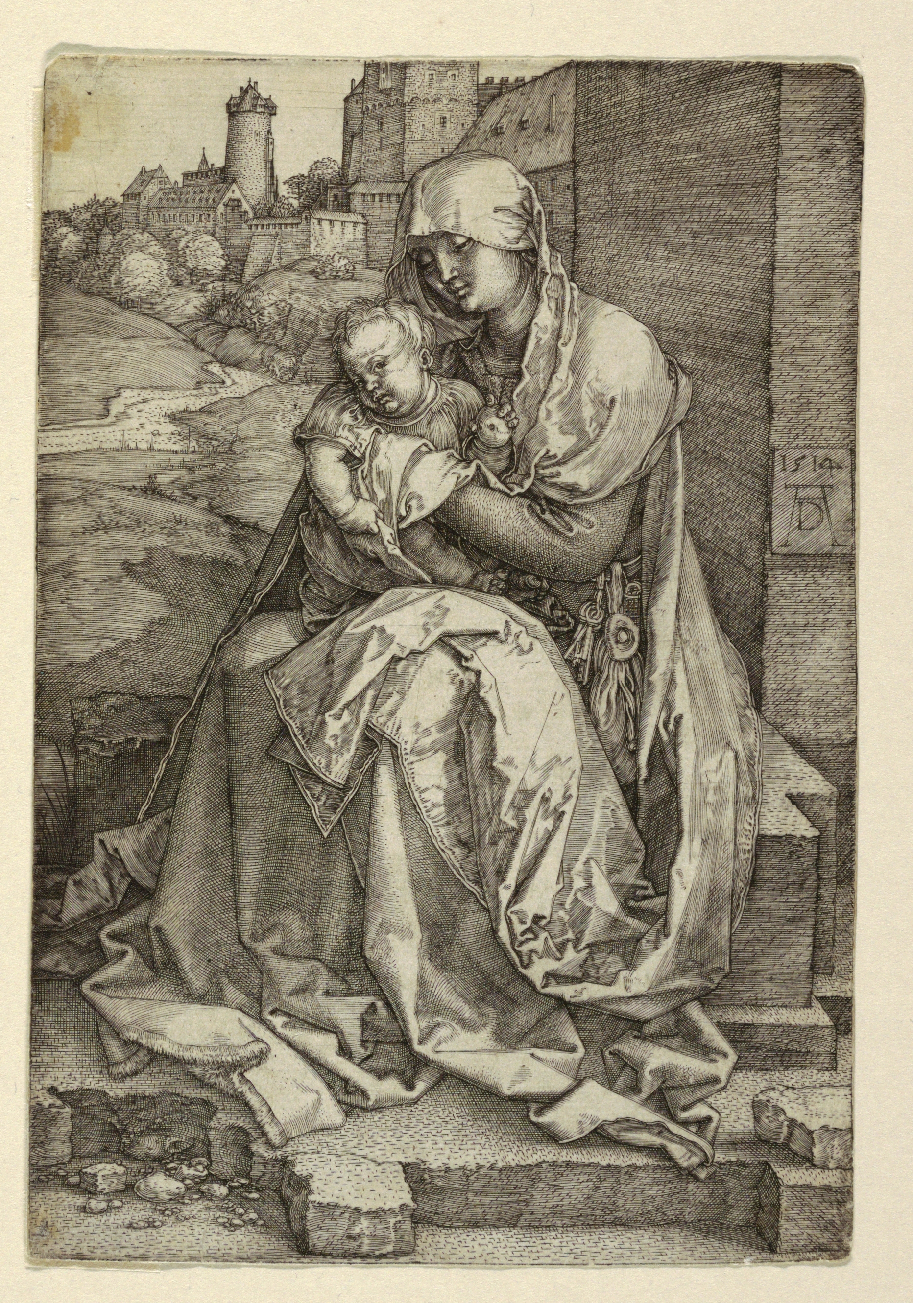 Print, The Virgin Sitting by a Wall; Print Maker: Albrecht Dürer (German, 1471–1528); Germany; engraving on white laid paper; 14.7 x 10.1 cm (5 13/16 x 4 in.); Bequest of George Campbell Cooper; 1896-3-13