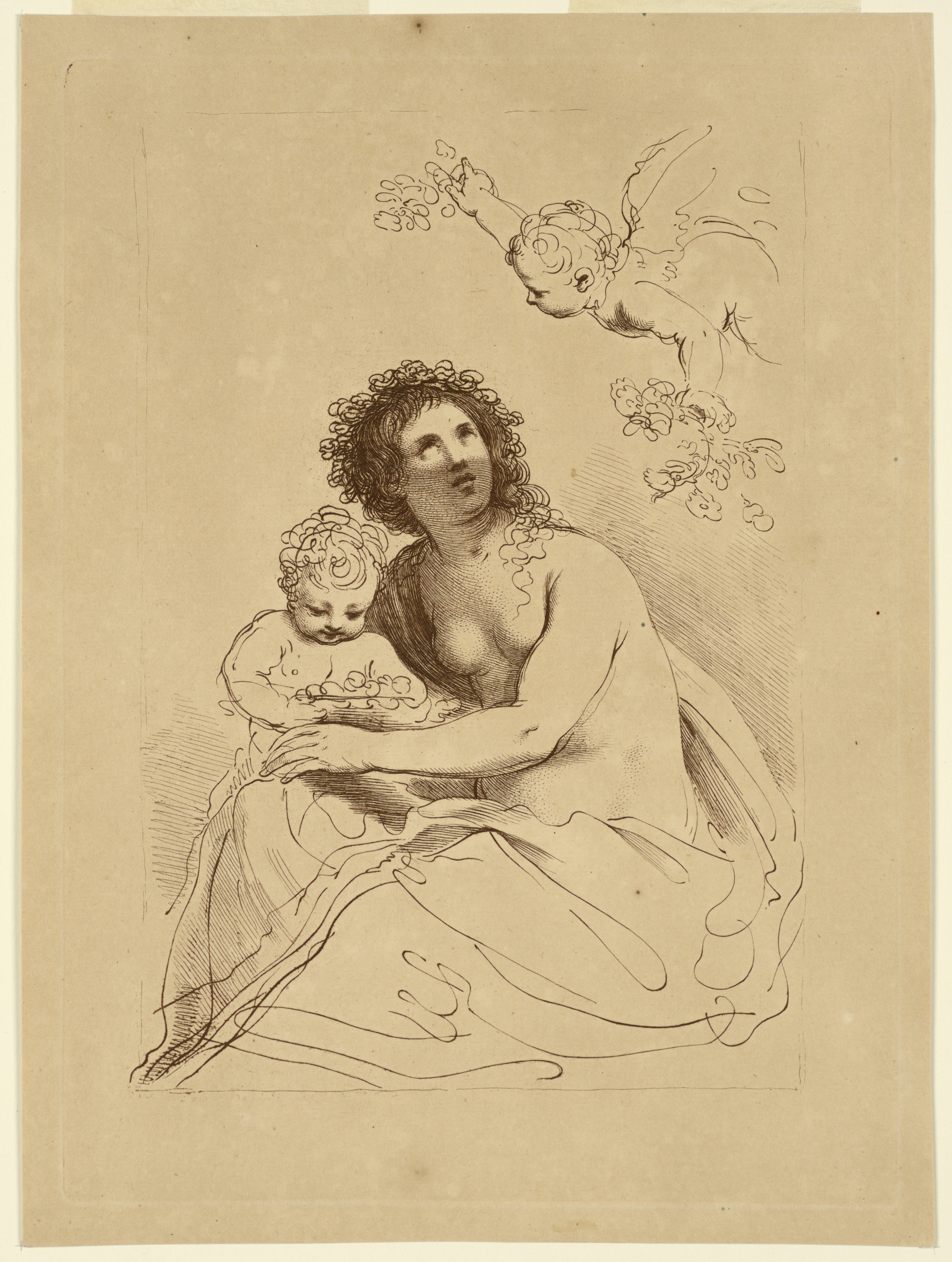Print, Flora with Boys; Print Maker: Francesco Bartolozzi (Italian, 1727–1815); After Giovanni Francesco Barbieri (called Guercino) (Italian, 1591 – 1666); Italy; engraving in brown ink on white paper; 29.6 × 21.6 cm (11 5/8 × 8 1/2 in.); Bequest of George Campbell Cooper; 1896-3-292
