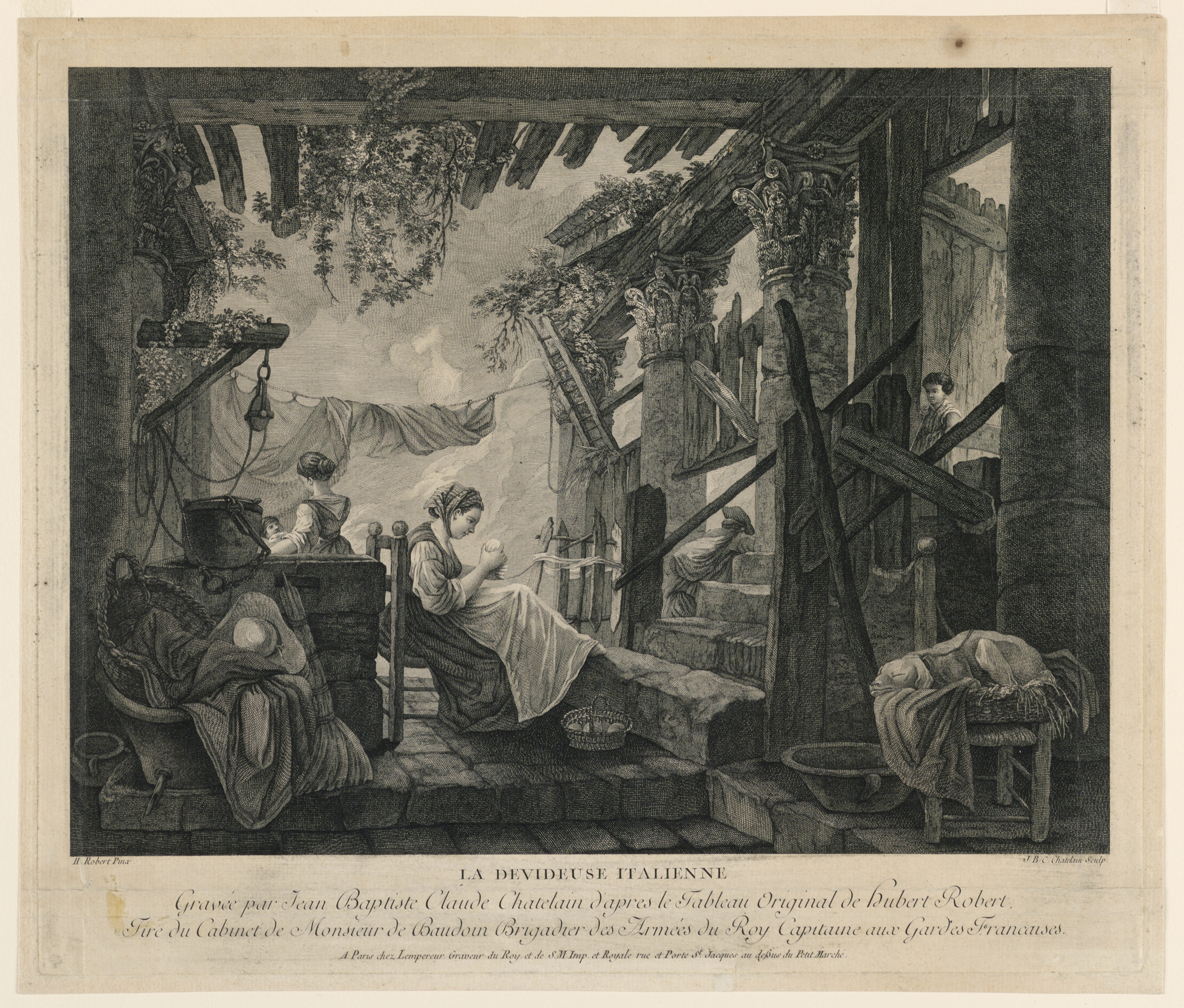 Print, The Italian Yarn-Winder; Print Maker: Jean-Baptiste-Claude Chatelain (French, 1710 - 1771); After Hubert Robert (French, 1733 – 1808); France; engraving on paper; 32 × 37.8 cm (12 5/8 × 14 7/8 in.); 1896-31-75