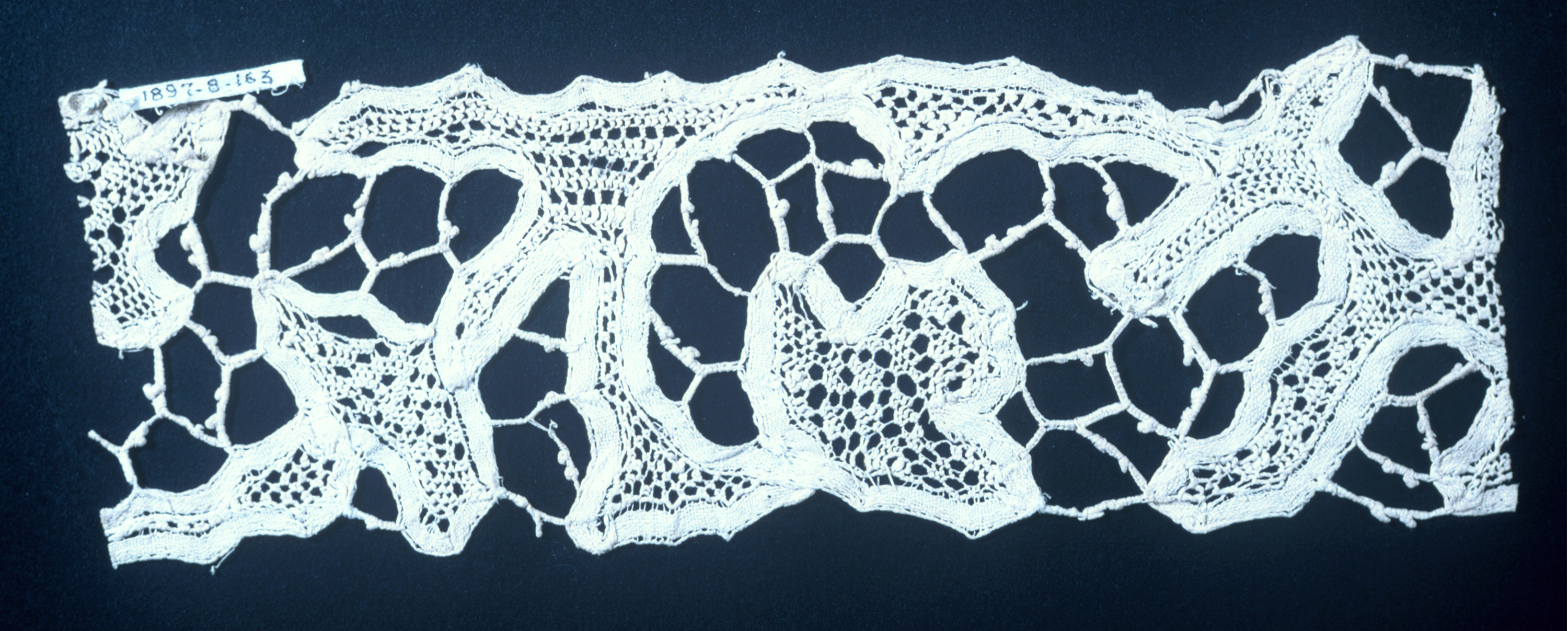 This is a Fragment. It is dated 17th century. Its medium is linen and its technique is lace of early premade tape with needle work fillings. It is a part of the Textiles department.