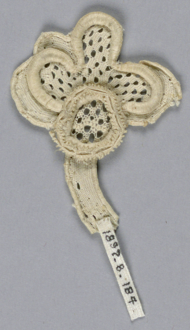 This is a Fragment. It is dated 17th century. Its medium is linen and its technique is needle lace. It is a part of the Textiles department.