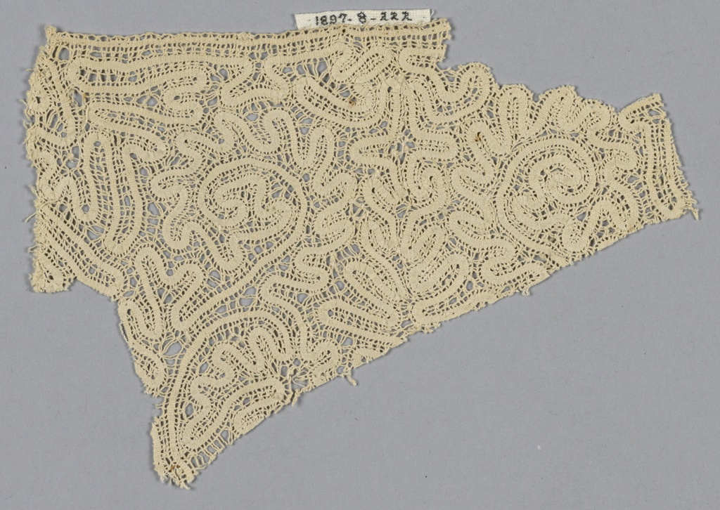 This is a Fragment. It is dated 17th century. Its medium is linen and its technique is bobbin made continuous tape with connections. It is a part of the Textiles department.