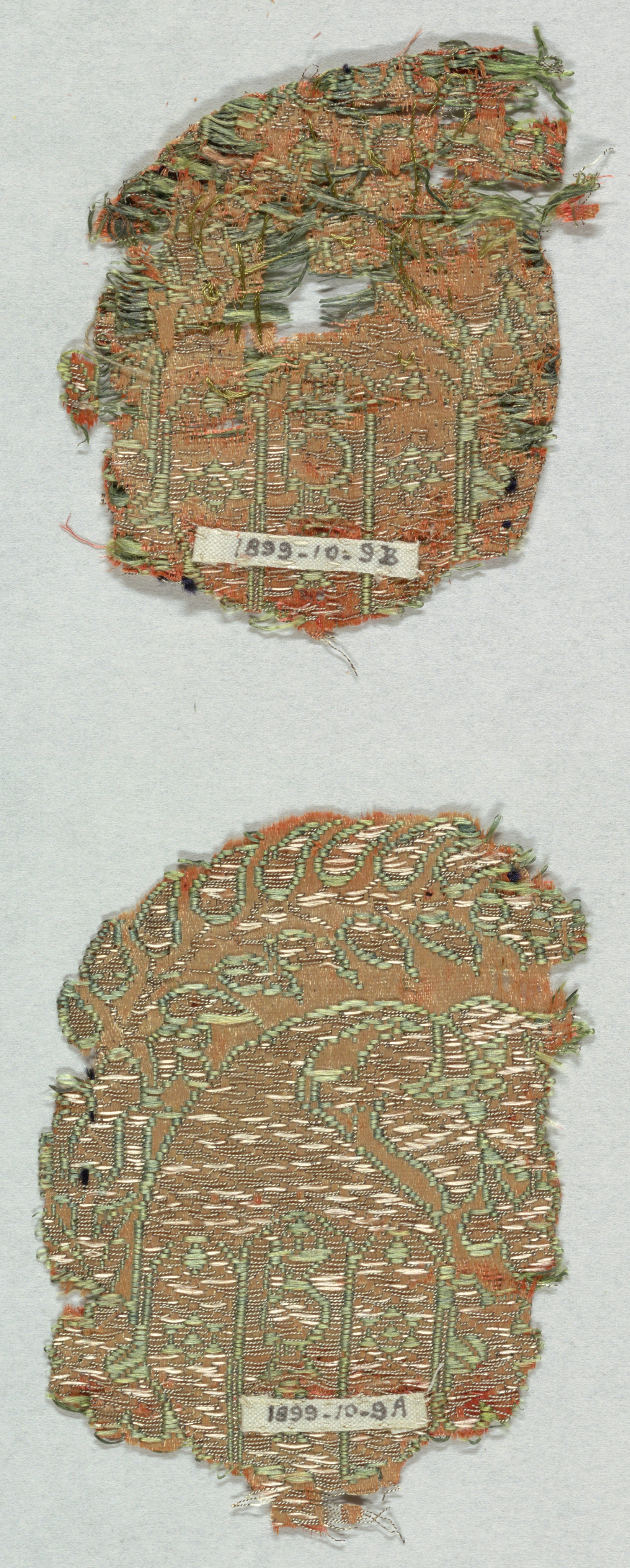 Fragment (Near East); silk, metallic thread; H x W (a): 9.7 × 7.2 cm (3 13/16 × 2 13/16 in.) H x W (b): 8.7 × 6.1 cm (3 7/16 × 2 3/8 in.); Gift of George A. Hearn; 1899-10-9-a,b