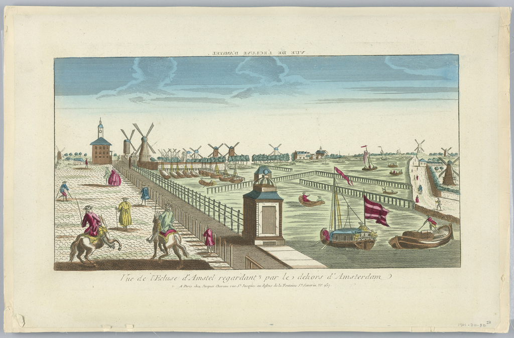 Print, Peep-show, Vue de l'Ecluse d'Amstel Regardant Par le Dehors d'Amsterdam; France; engraving in ink with washes of watercolor on paper, mounted on scrapbook paper; 24.3 × 41.9 cm (9 9/16 × 16 1/2 in.); Gift of Mrs. Edward R. Wharton; 1901-30-30