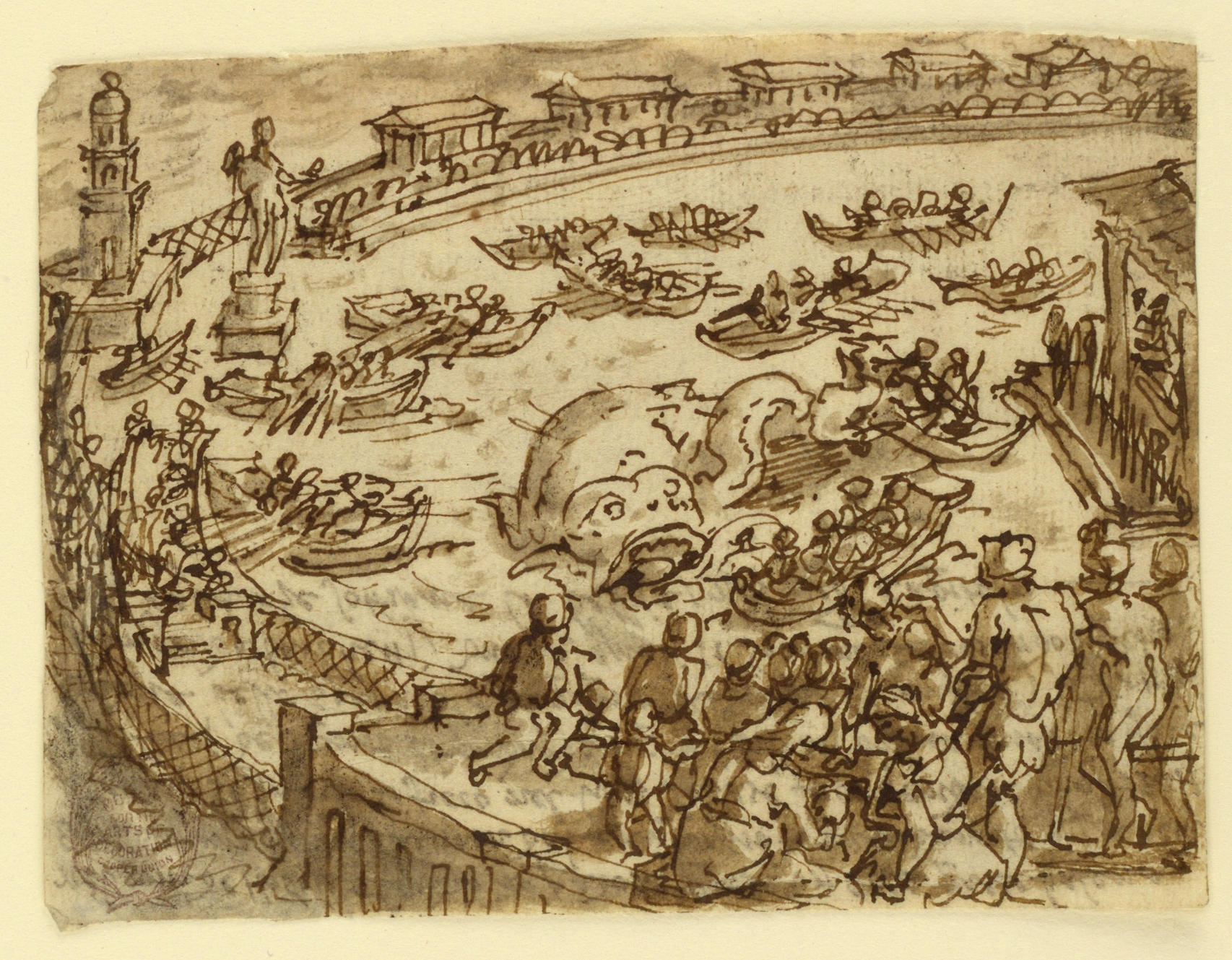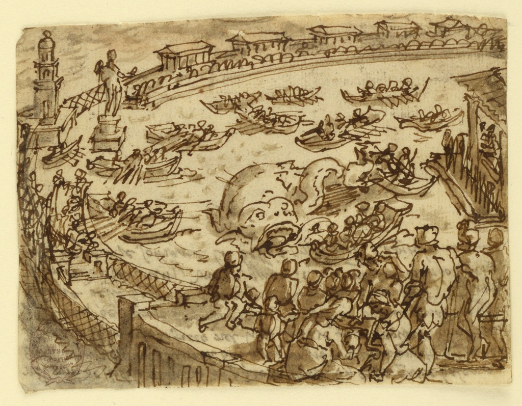 Verso, inscribed in pen and ink: "nel porto de Hostia claudio imperadore prese un orca pesse balena Rra venuta quivi allettata dal naufragio di pelle venute di francia li quali seguendo si ficco nel lido, Cesare fece tendere molto Reti alle focci del porto et andandovi con i soldati di sua guardia fece vedere bello spettacolo al popolo Romano tiravano i soldati lange da barchetti, uno de quali si sommerse essendo ripeno al aqua che sottiava la bestia nel med(esi)mo capitolo"