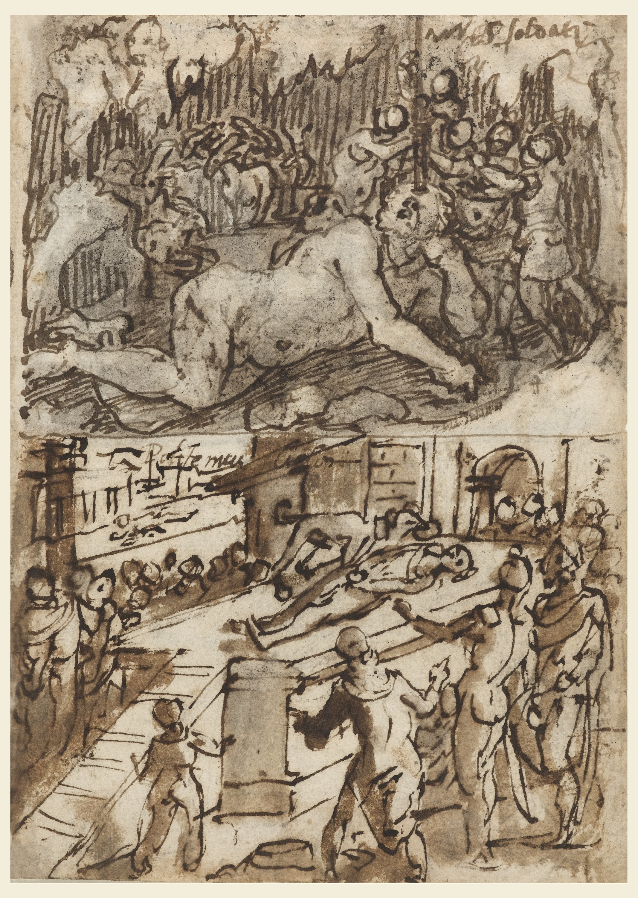 Drawing, Blinding of the Cyclops Polyphemus [above]; The Fidelity of a Roman Dog [below]; Jan van der Straet, called Stradanus (Flemish, 1523–1605); Italy; pen and brown ink, brush and gray and brown wash, on laid paper; 15.2 x 11 cm (6 x 4 5/16 in.); Museum purchase through gift of various donors; 1901-39-146