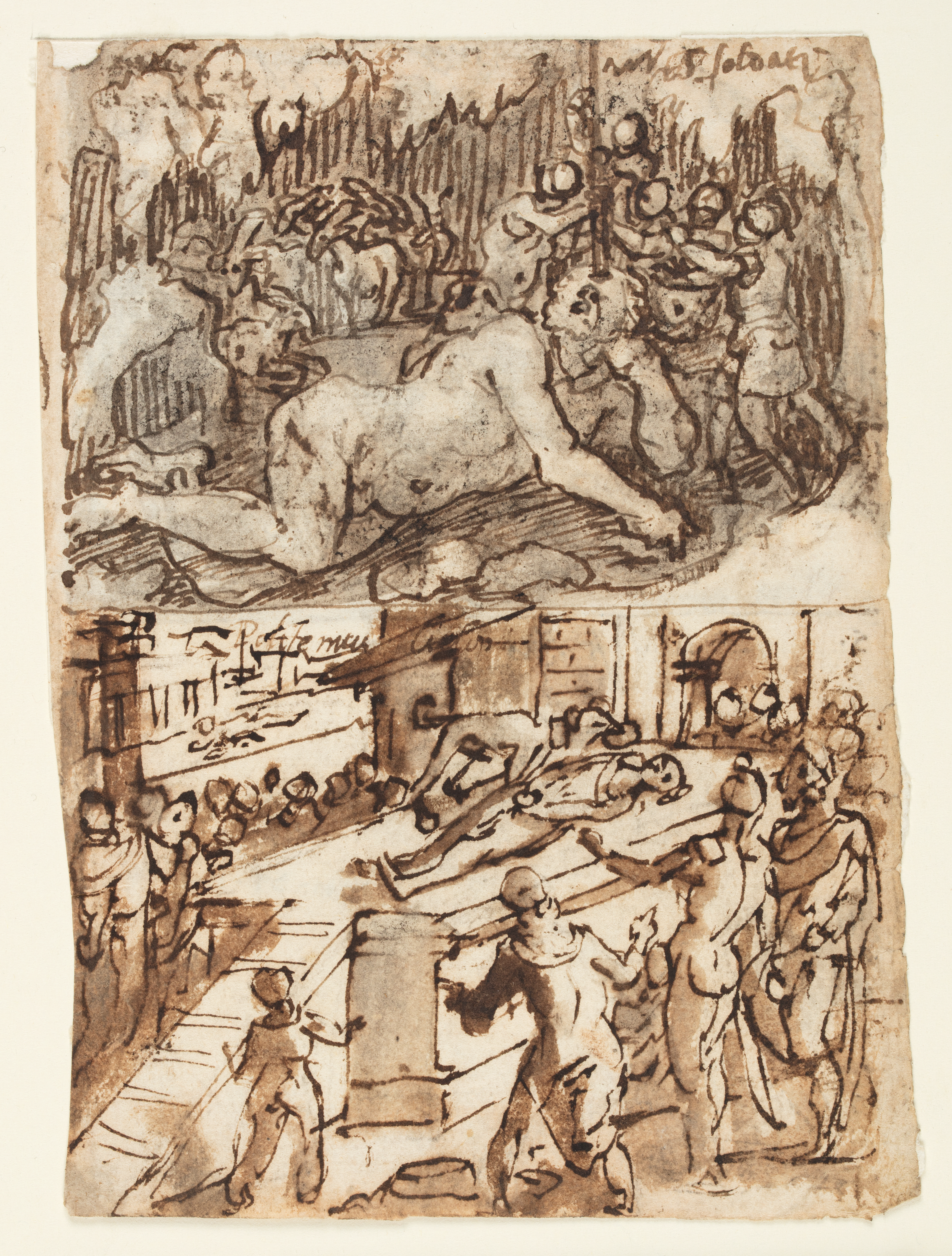 Drawing, Blinding of the Cyclops Polyphemus [above]; The Fidelity of a Roman Dog [below]; Jan van der Straet, called Stradanus (Flemish, 1523–1605); Italy; pen and brown ink, brush and gray and brown wash, on laid paper; 15.2 x 11 cm (6 x 4 5/16 in.); Museum purchase through gift of various donors; 1901-39-146