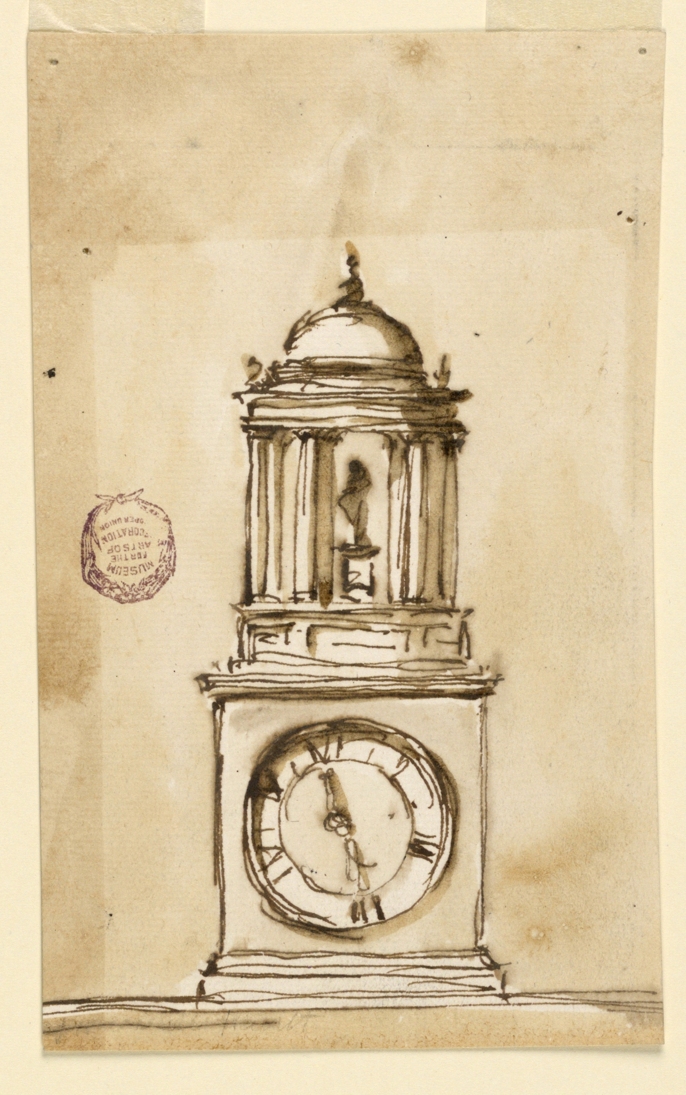 Drawing, Timepiece; Architect: Giuseppe Barberi (Italian, 1746–1809); Italy; pen and brown ink, brush and brown wash, graphite, on off-white laid paper; 16.9 x 10.3 cm (6 5/8 x 4 1/16 in.); Museum purchase through gift of various donors; 1901-39-1517