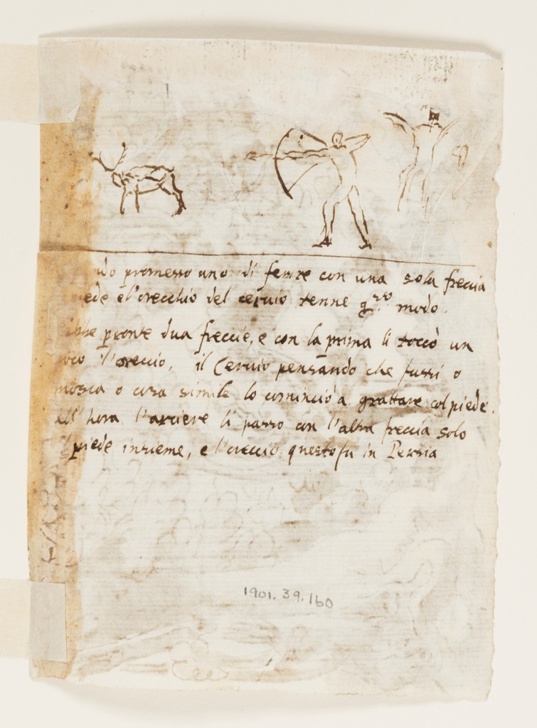 Verso, inscribed in pen and ink: "quando promesso uno di ferire con una sola freccia / piede e l'orecchio del cervio tenne questo modo. / Ebbe pronte dua freccie, e con la prima li tocco un / poco l'oreccio, il cervio pensando che fussi o / mosca o cosa simile lo comincio a grattare col piede. / All' hora l'arciere li passo con l'altra freccia solo / il piede insieme, e l'oreccio questo fu in Persia" [in the hand of Luigi Alamanni]