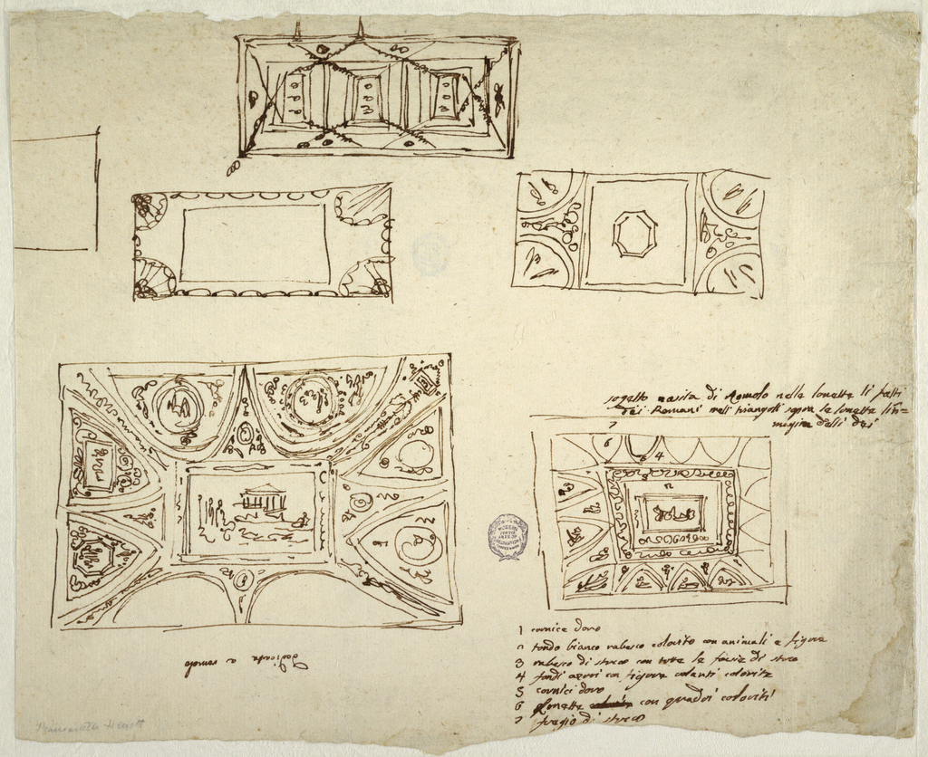 Caption written at bottom: in opposite direction, "dedicat a romolo". Bottom right, "sogetto nasita di Romolo nelle lunette li fatti/ dei Romani neli triangoli sopra le lunette l'im' magini delli dei". "cornice d'oro/ 2 tondo bianco rabesco colorito con animali e figure/ 3 rabesco di stucco con tutte la fascie di stucco/ 4 fondi azuri con figure colanti colorite/ 5 cornici doro/ 6 Lunette ("colorite" struck out) con quadri coloriti/ 7 fregio di stucco."