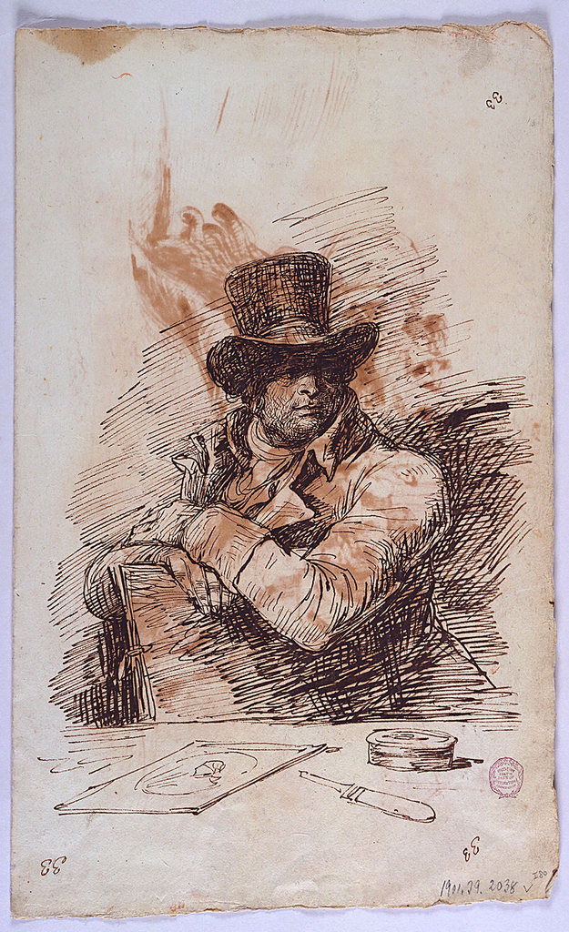 Drawing, Self-Portrait of Felice Giani; recto: Muses Seated Beneath a Tree; Felice Giani (Italian, 1758–1823); Italy; pen and brown ink, brush and brown wash on cream wove paper; 39.2 x 24.7 cm (15 3/8 x 9 3/4 in), irregular; Museum purchase through gift of various donors; 1901-39-2038