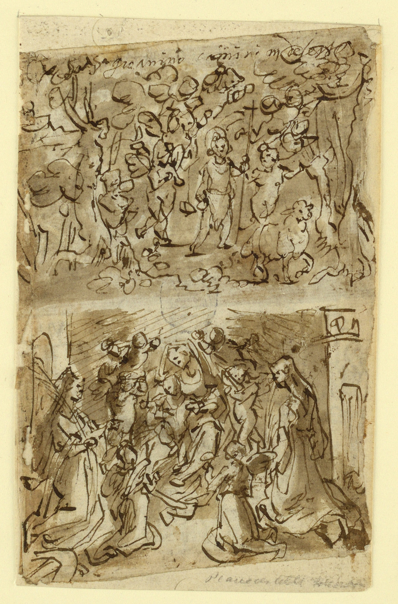Drawing, The Infant John in the Wilderness accompanied by Angels [above]; Virgin and Child with Saint Catherine and Saint Barbara [below]