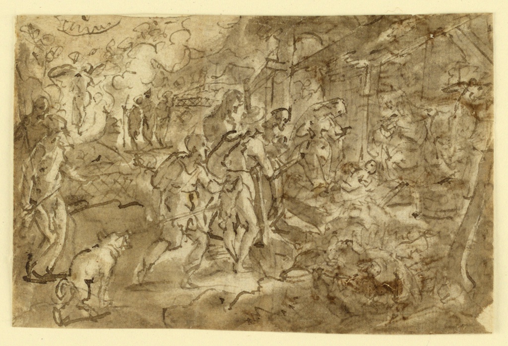 Drawing, Adoration of the Shepherds; Jan van der Straet, called Stradanus (Flemish, 1523–1605); Engraved by Adriaen Collaert (Flemish, ca. 1560 – 1618); Published by Philips Galle (Flemish, 1537 - 1612); Netherlands; pen and brown ink, brush and wash on laid paper; 9.9 × 14.8 cm (3 7/8 × 5 13/16 in.); Museum purchase through gift of various donors; 1901-39-2655