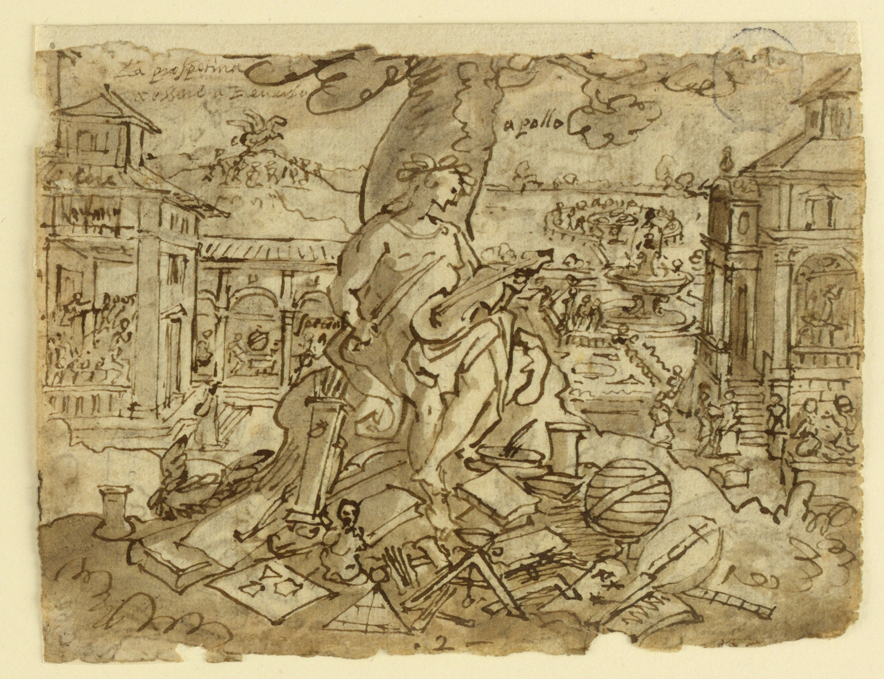 Recto, inscribed in pen and ink at upper left: " Apollo" "la prospetiva / a essere a reverso" "spe(cula)" Recto, bottom center, numbered in pen and ink: ".2."