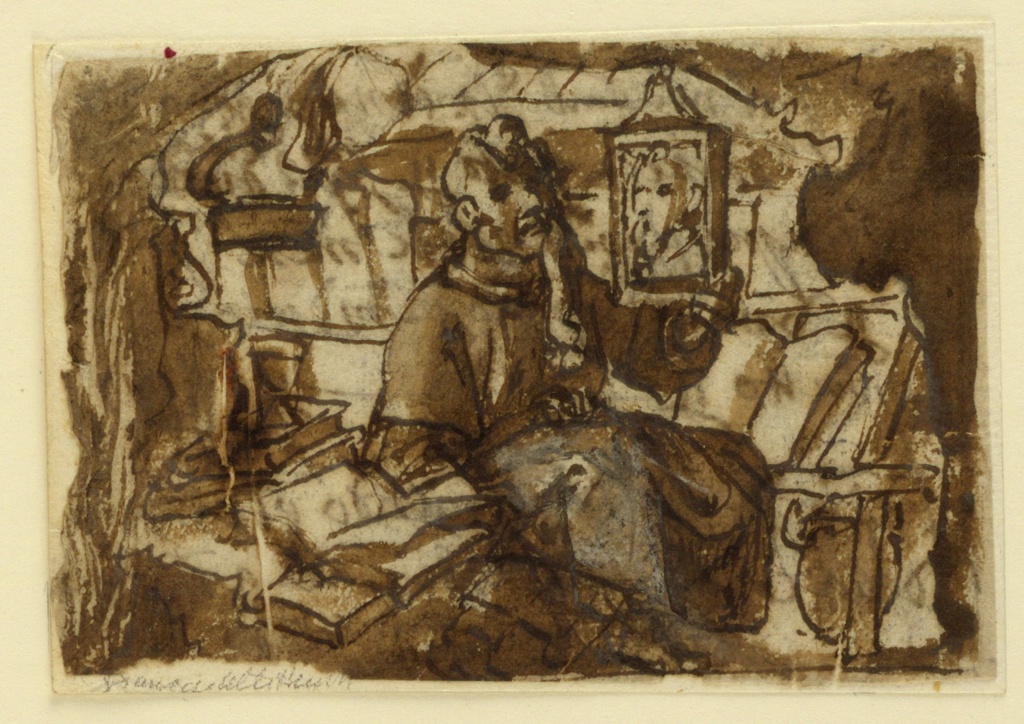 Drawing, Man Looking in a Mirror, Possibly Socrates Teaching Self-Knowledge; Jan van der Straet, called Stradanus (Flemish, 1523–1605); Netherlands; pen and brown ink, brush and wash, over black chalk on paper; 7.3 × 10.7 cm (2 7/8 × 4 3/16 in.); Museum purchase through gift of various donors; 1901-39-2678