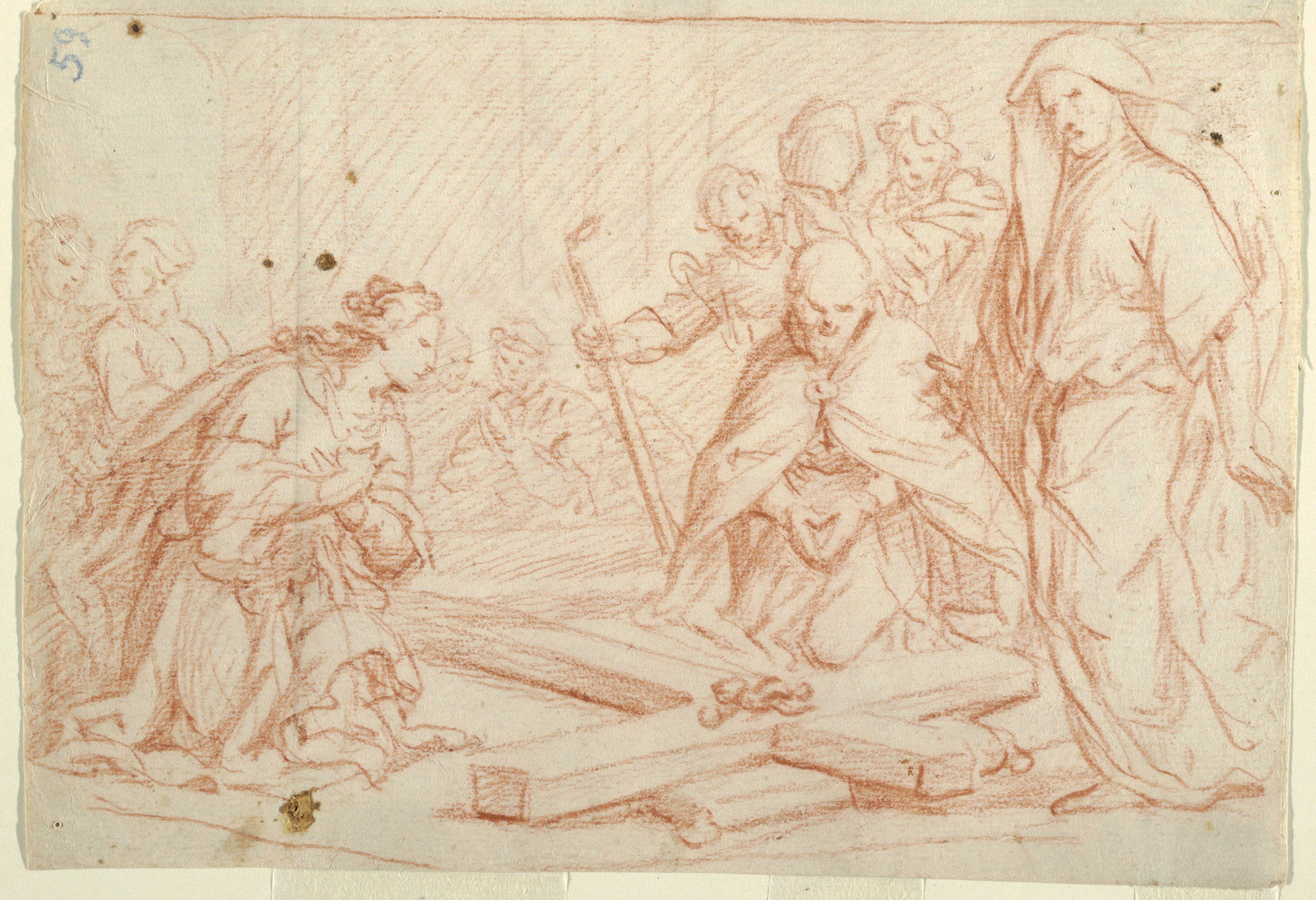 Drawing, Finding of the Cross; Attributed to Luca Giordano (Italian, 1634 - 1705); Italy; red chalk on cream laid paper; 27.3 x 20.2 cm (10 3/4 x 7 15/16 in.); Museum purchase through gift of various donors; 1901-39-2713
