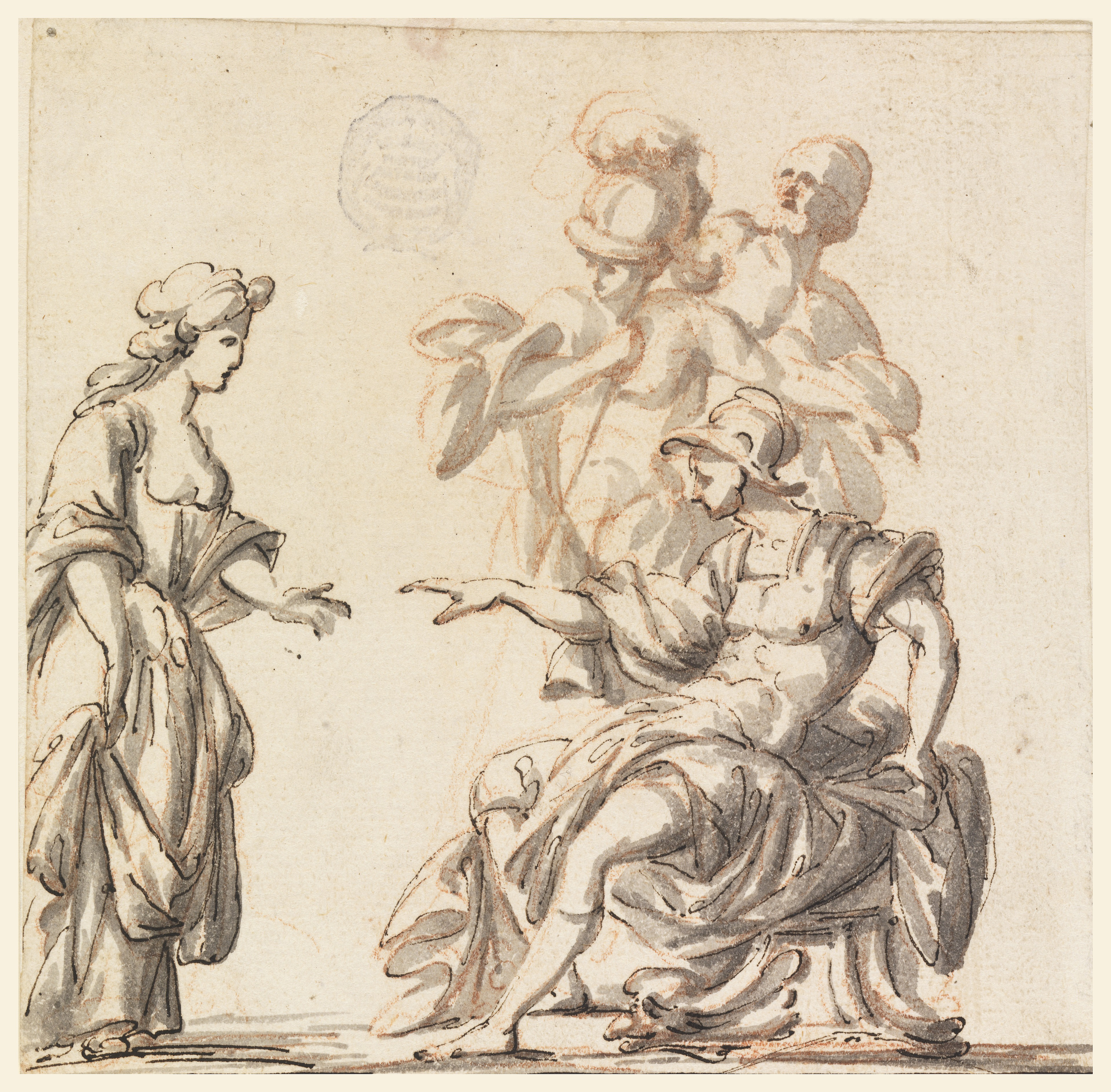 Drawing, A Classic Warrior Receives a Woman; Filippo Marchionni (Italian, 1732–1805); Italy; red crayon, black ink, grey watercolor on paper; 12.6 × 12.6 cm (4 15/16 × 4 15/16 in.); Museum purchase through gift of various donors; 1901-39-2813