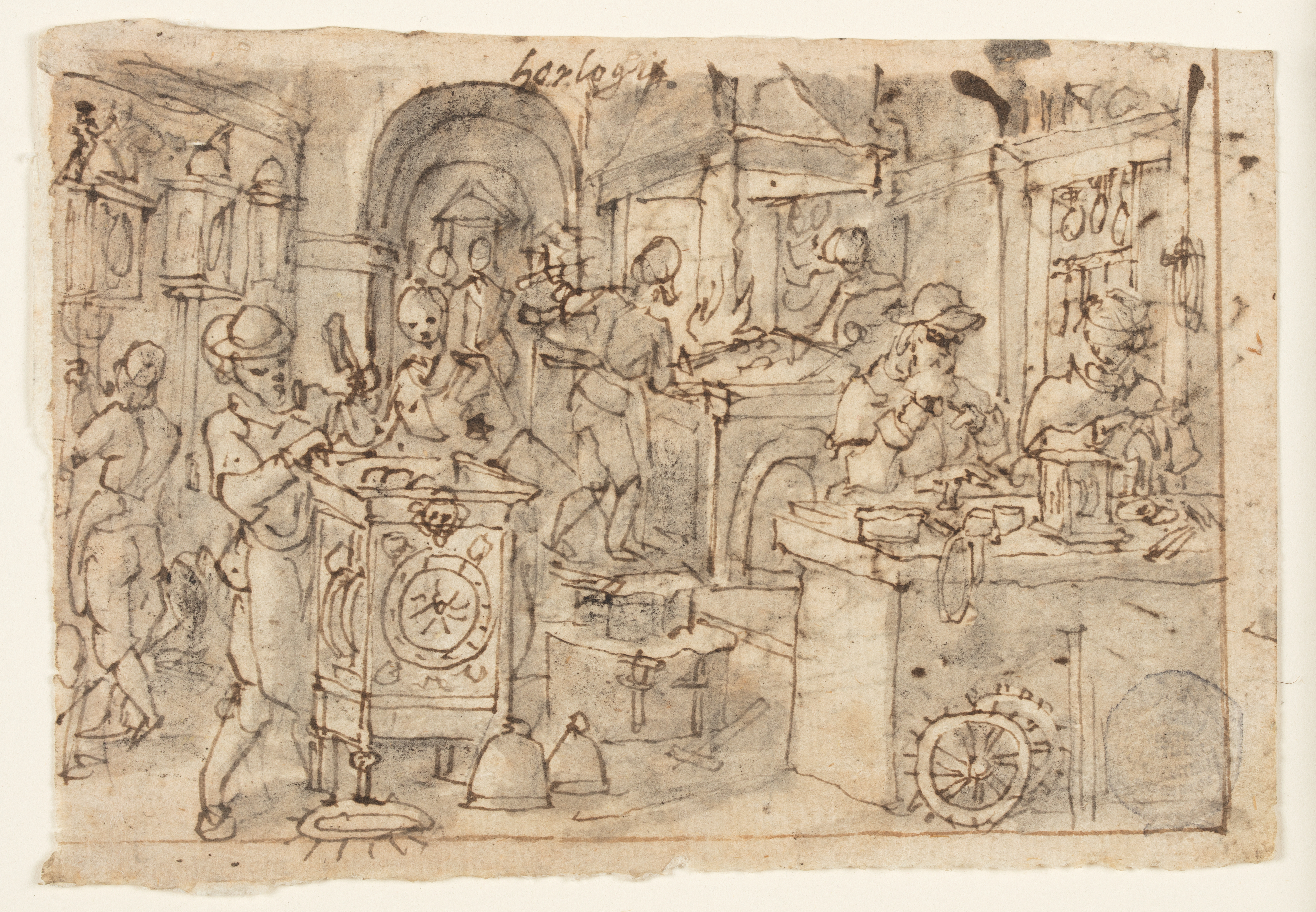 Drawing, The Invention of Clockwork; Jan van der Straet, called Stradanus (Flemish, 1523–1605); Published by Philips Galle (Flemish, 1537 - 1612); Client: Luigi Alamanni (Italian, 1558–1603); Netherlands; pen and brown ink, brush and gray and brown wash, black chalk on laid paper ; 10.2 × 14.5 cm (4 in. × 5 11/16 in.); Museum purchase through gift of various donors; 1901-39-304
