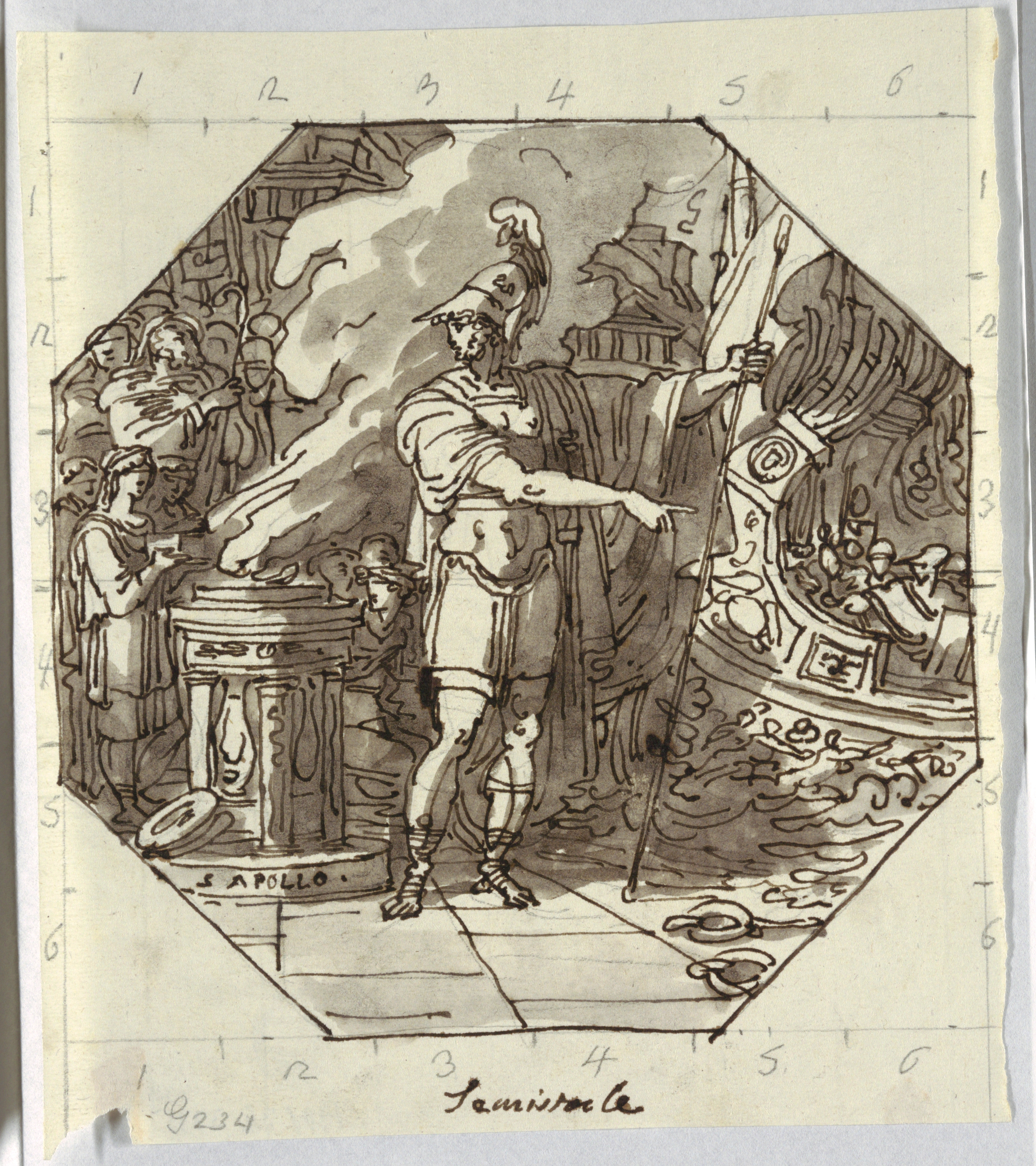 Drawing, Themistocles; Designed by Felice Giani (Italian, 1758–1823); Italy; pen and brown ink, brush and brown wash over traces of graphite on cream laid paper; 18.3 x 20.9 cm (7 3/16 x 8 1/4 in.); Museum purchase through gift of various donors; 1901-39-3335