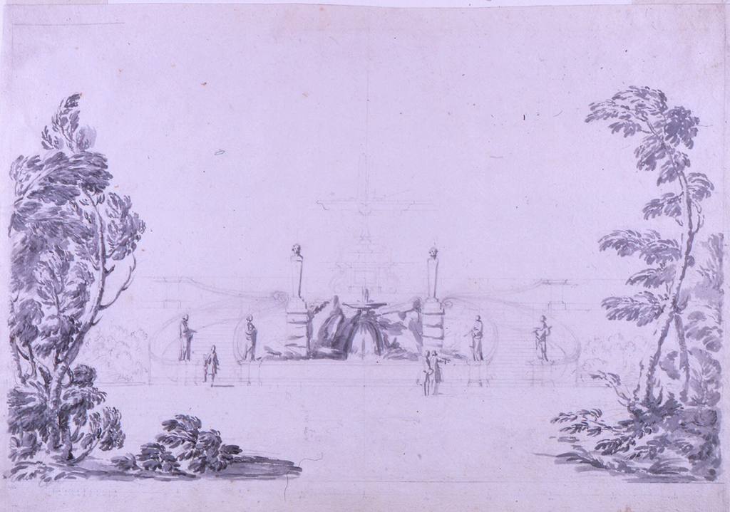 Drawing, Sketch for a Fountain in Park; Carlo Marchionni (Italian, 1702–1786); Italy; graphite, brush and gray watercolor on laid paper; 48.5 x 35.4 cm (19 1/8 x 13 15/16 in.); Museum purchase through gift of various donors; 1901-39-404