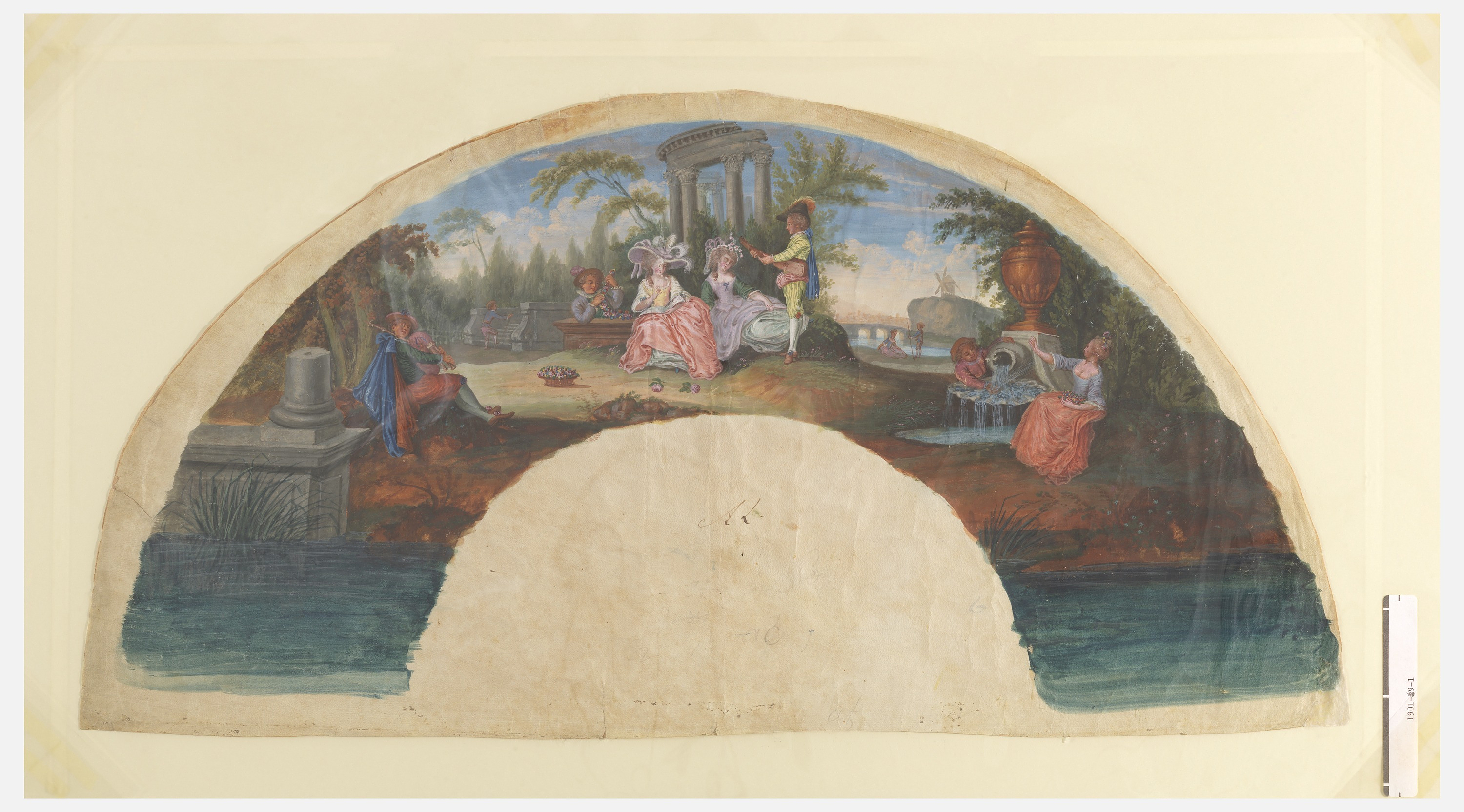 This is a Fan leaf. It is dated ca. 1760 and we acquired it in 1901. Its medium is brush and gouache on vellum . It is a part of the Textiles department.