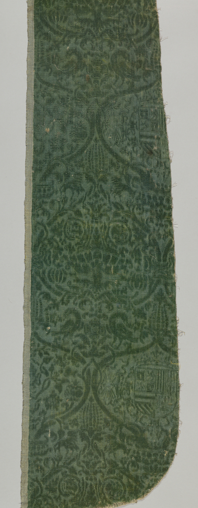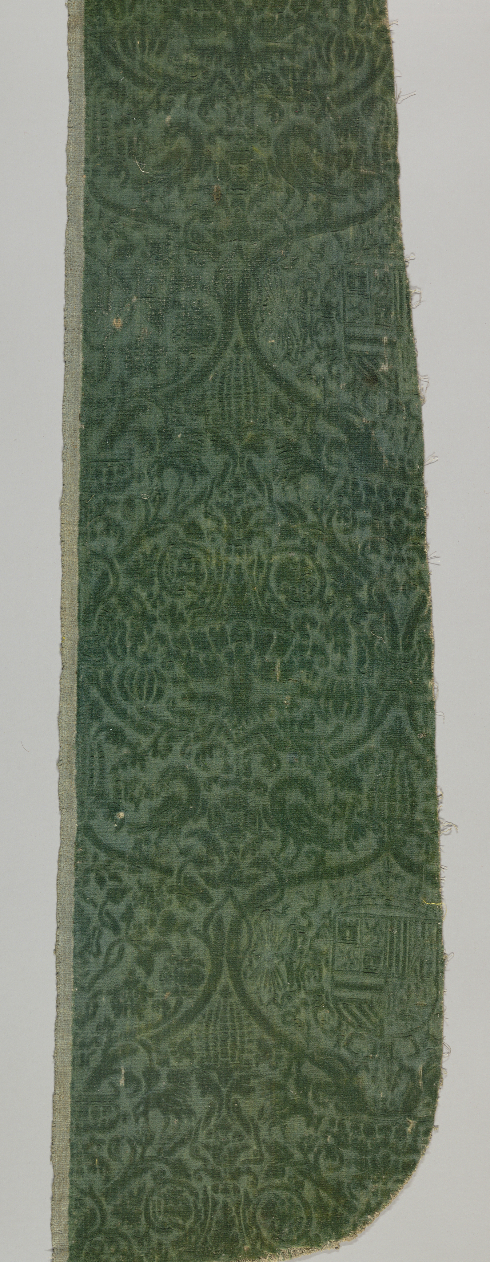 This is a Fragments of a chasuble. It is dated 16th–17th century and we acquired it in 1902. Its medium is wool, linen and its technique is supplementary warp forming cut pile (velvet0 then stamped (embossed). It is a part of the Textiles department.