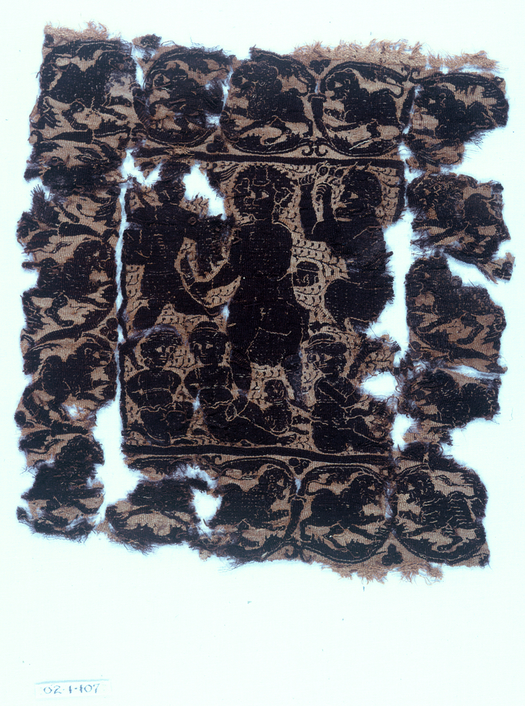 This is a Square. It is dated 6th century and we acquired it in 1902. Its medium is warp; s-spun linen. wefts; s-spun linen carried in pairs, z-spun linen, z-spun wool, z-spun silk and its technique is slit tapestry. It is a part of the Textiles department.