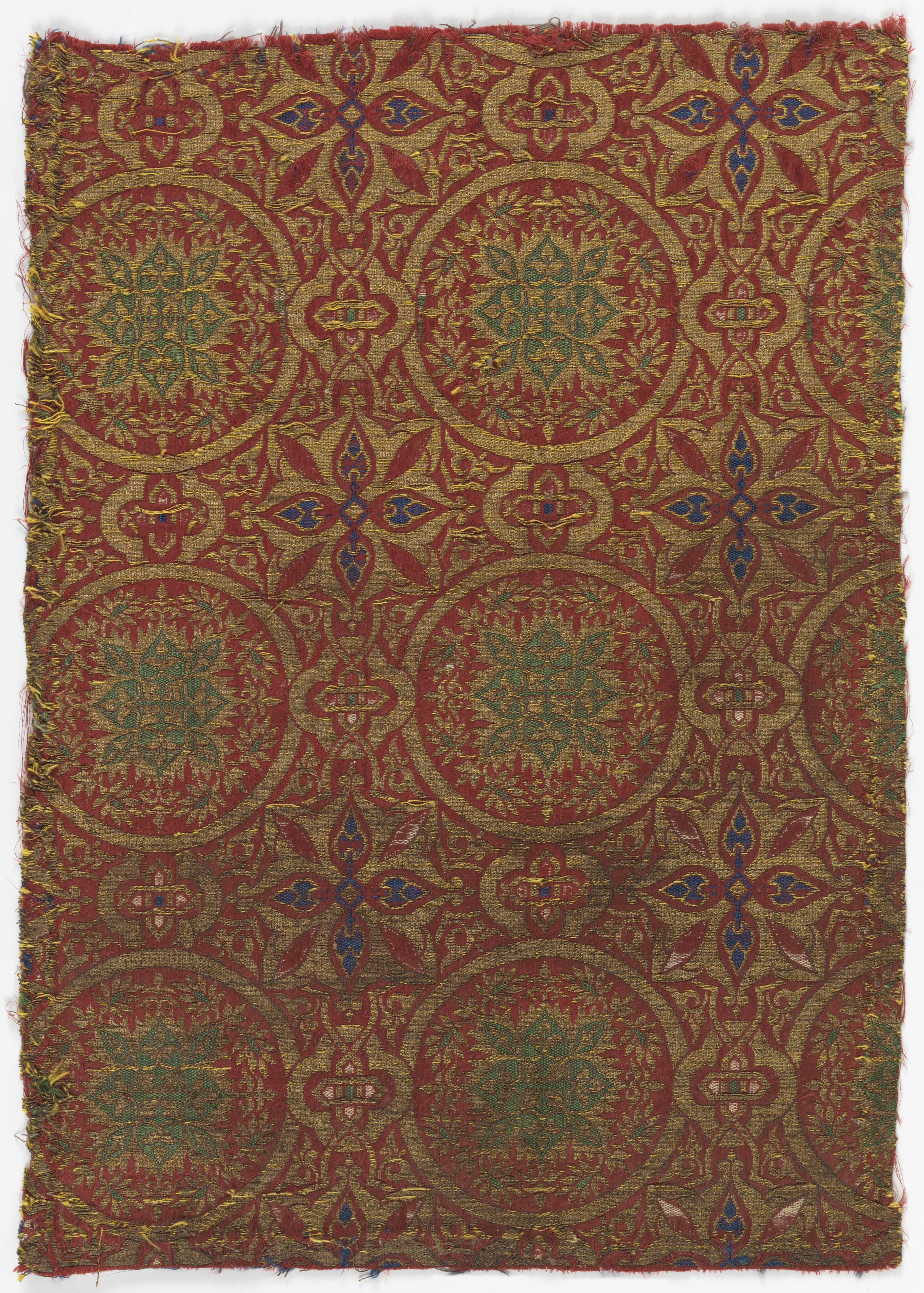 This Hispano-Moresque fragment, likely from Granada, was woven during the Nasrid dynasty (1232-1492) – the last Muslim kingdom in Spain. In the fourteenth century, colorful and delicate geometric designs were generously woven with gold thread to produce textiles with a jewel-like quality. In this example, the interlaced forms of the previous century have evolved into a complex pattern of slim gold rings linked by lobed medallions. Inside each ring is a symmetrical arrangement of lotus leaves enclosed by a palmette wreath. Pointed rosettes adorn the spaces between the rings.
