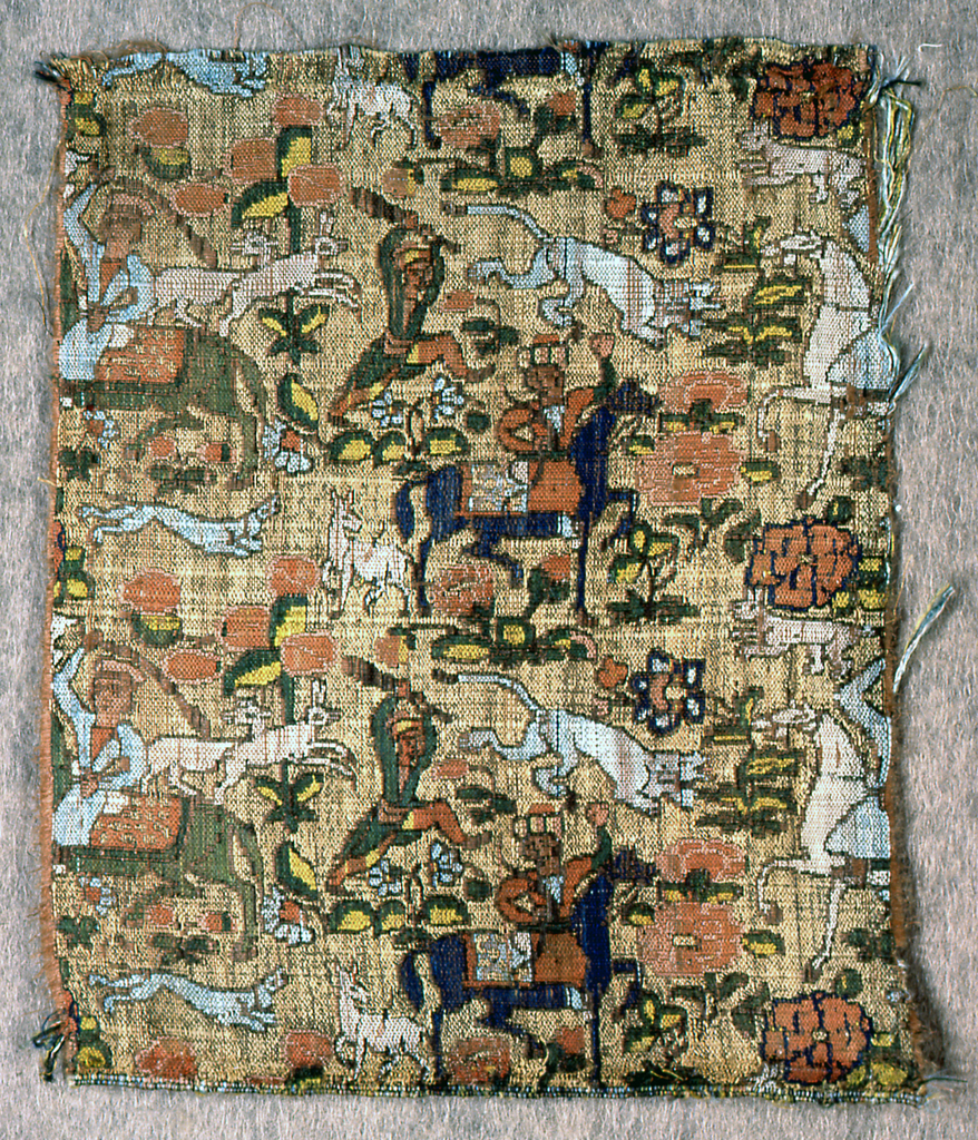Fragment; silk, metal foil applied to parchment core; Warp x Weft: 16.2 x 19.7 cm (6 3/8 x 7 3/4 in.); Gift of John Pierpont Morgan; 1902-1-402