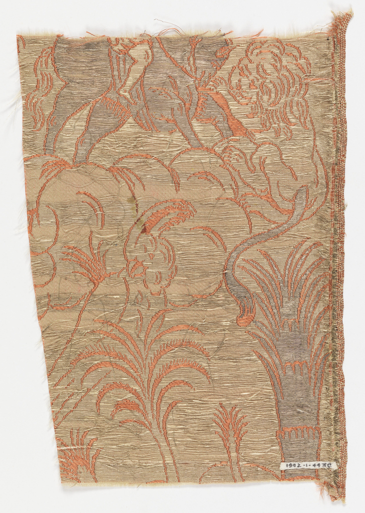 This is a Fragment. It is dated late 17th century and we acquired it in 1902. Its medium is silk, metallic and its technique is 7&1 satin patterned by weft floats. It is a part of the Textiles department.