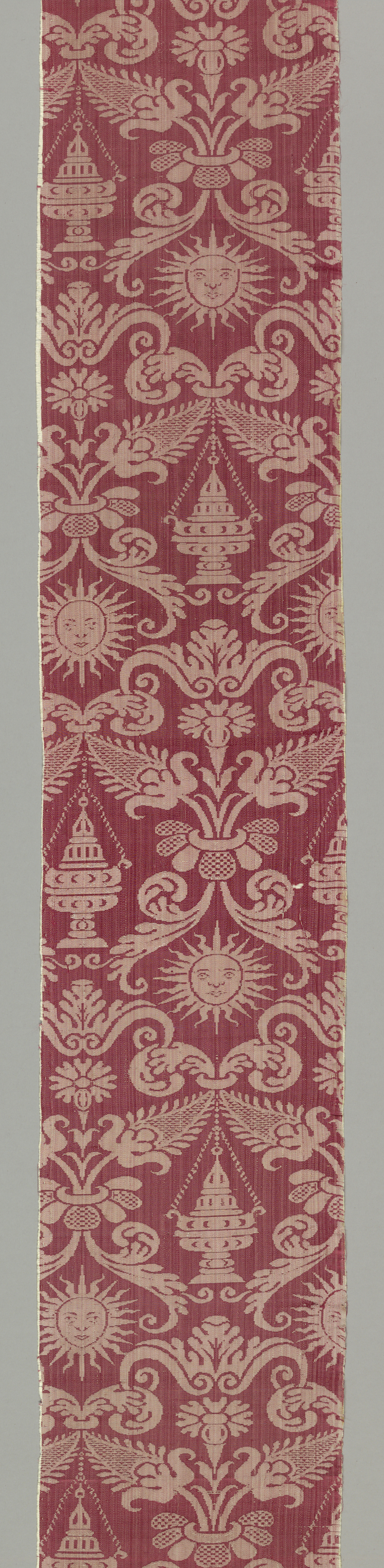 This is a Fragment . It is dated 17th century and we acquired it in 1902. Its medium is silk and its technique is 4&1 satin damask. It is a part of the Textiles department.