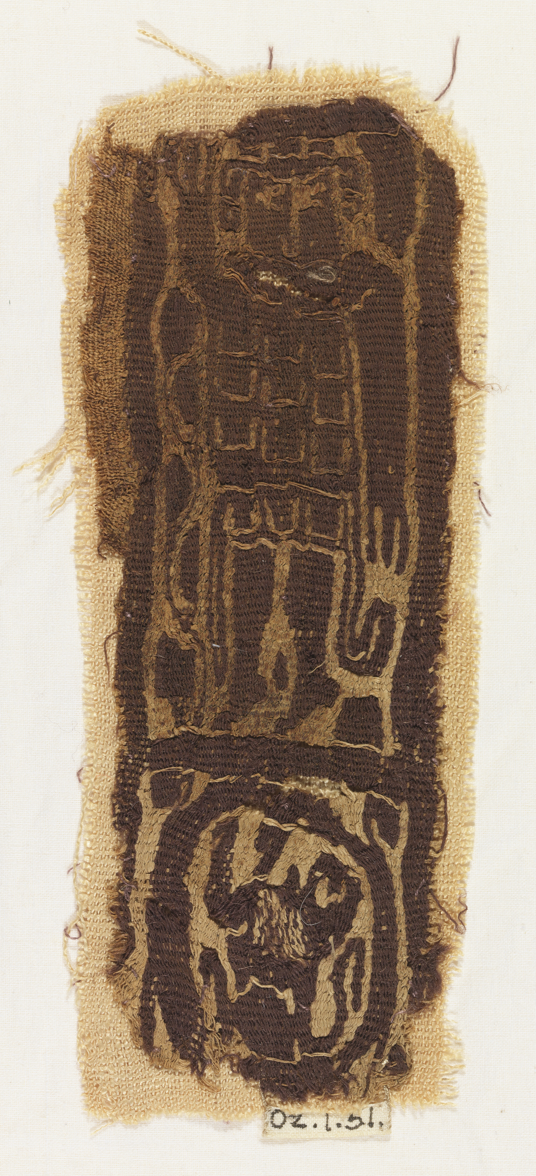 This is a Band fragment. It is dated 3rd–5th century and we acquired it in 1902. Its medium is warp; s-spun linen. wefts; z-spun linen, z-spun wool and its technique is woven slit tapestry with supplementary weft wrapping. It is a part of the Textiles department.